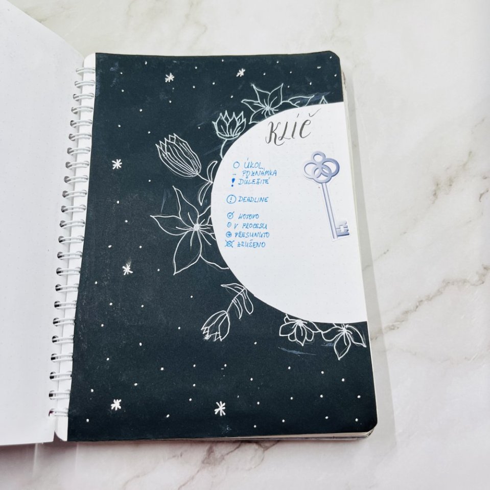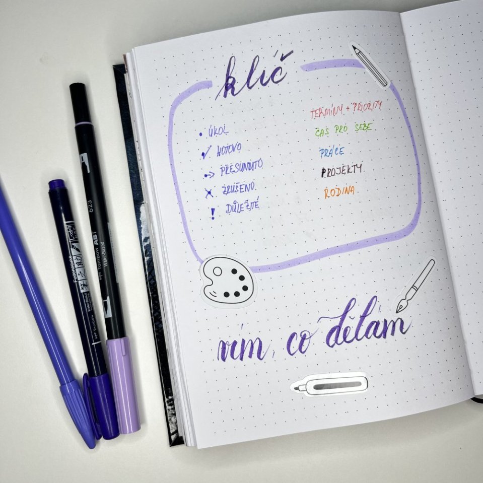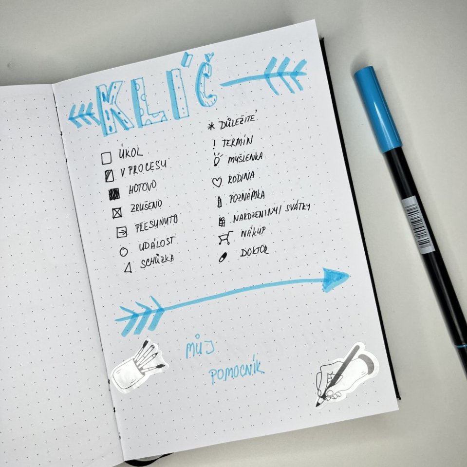 Klíč v bullet journalu je seznam symbolů, ikon nebo barev, které používáš k rychlé orientaci ve svém plánovacím systému. Slouží jako vizuální návod, který ti okamžitě ukáže:
