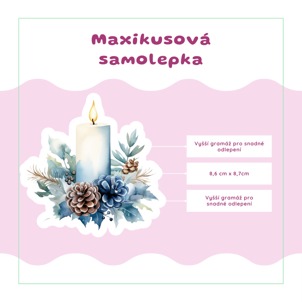 Tenhle motiv jsem si zamilovala na první pohled – vyzařuje z něj klid, ticho a světlo přesně jako z adventního večera ✨🕯️. Miluju, jak se modrá svíčka snoubí s chladnými šiškami a zmrzlými větvičkami – jako kdyby zastavila čas. Tuhle maxisamolepku si lepím na úvod prosince nebo jako dekoraci do plánovače, když si chci připomenout, že vánoční kouzlo začíná vnitřním světlem. Nejradši ji používám i na obálky nebo jako ozdobu na tvoření se svíčkami. Zkus ji nalepit tam, kde chceš zpomalit.