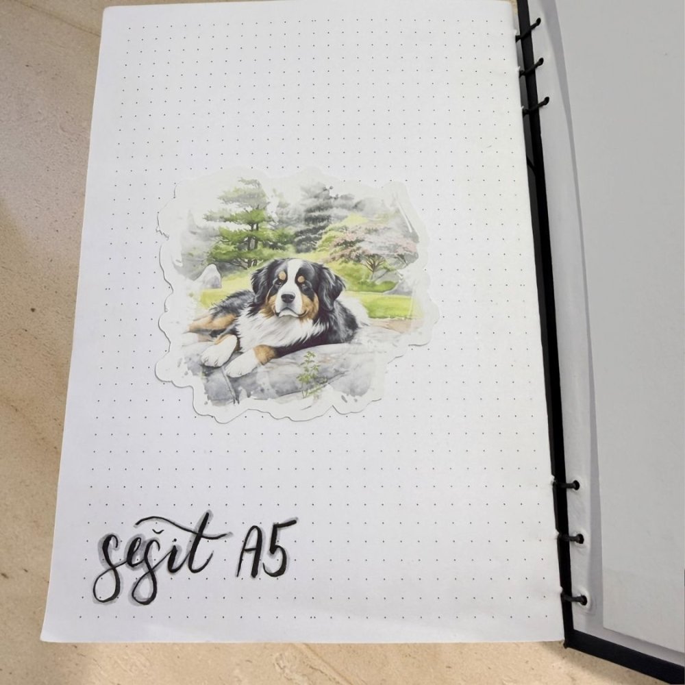 Motiv zachycuje bernského salašnického psa odpočívajícího v jemné, zelené krajině. Okolí tvoří stromy, kameny a jemné přírodní detaily, které působí uklidňujícím dojmem. Barevná paleta je přirozená – zelená, hnědá, černá a bílá se krásně doplňují. Celý obrázek působí vyváženě a klidně, jako tichý moment v přírodě. Je to motiv, který vnáší harmonii do každé stránky.