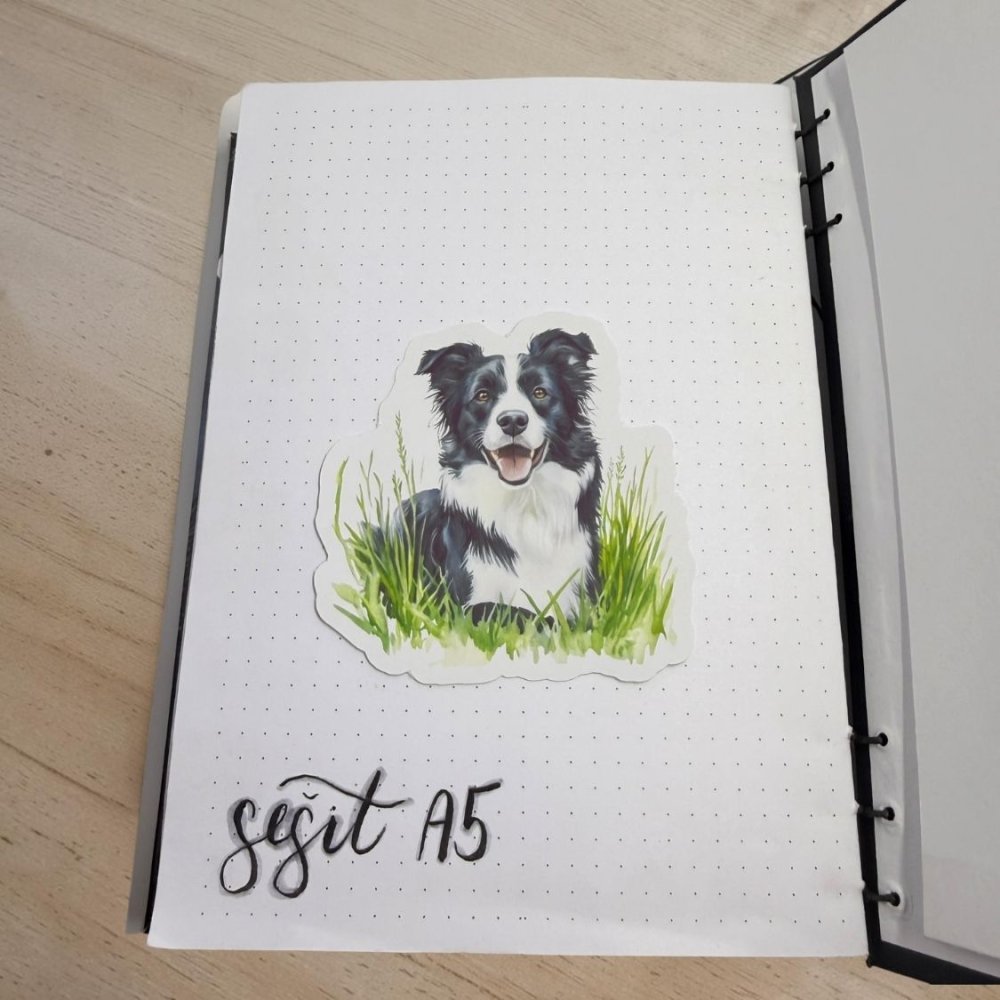 Motiv zachycuje border kolii obklopenou jemnou zelenou trávou. Černobílá srst krásně kontrastuje se svěžími přírodními tóny. Celý obrázek působí lehce akvarelově a velmi přirozeně. Atmosféra je hravá, živá a plná energie. Tyto samolepky do diáře vnesou do tvého plánování pohyb, radost a kousek přírody.