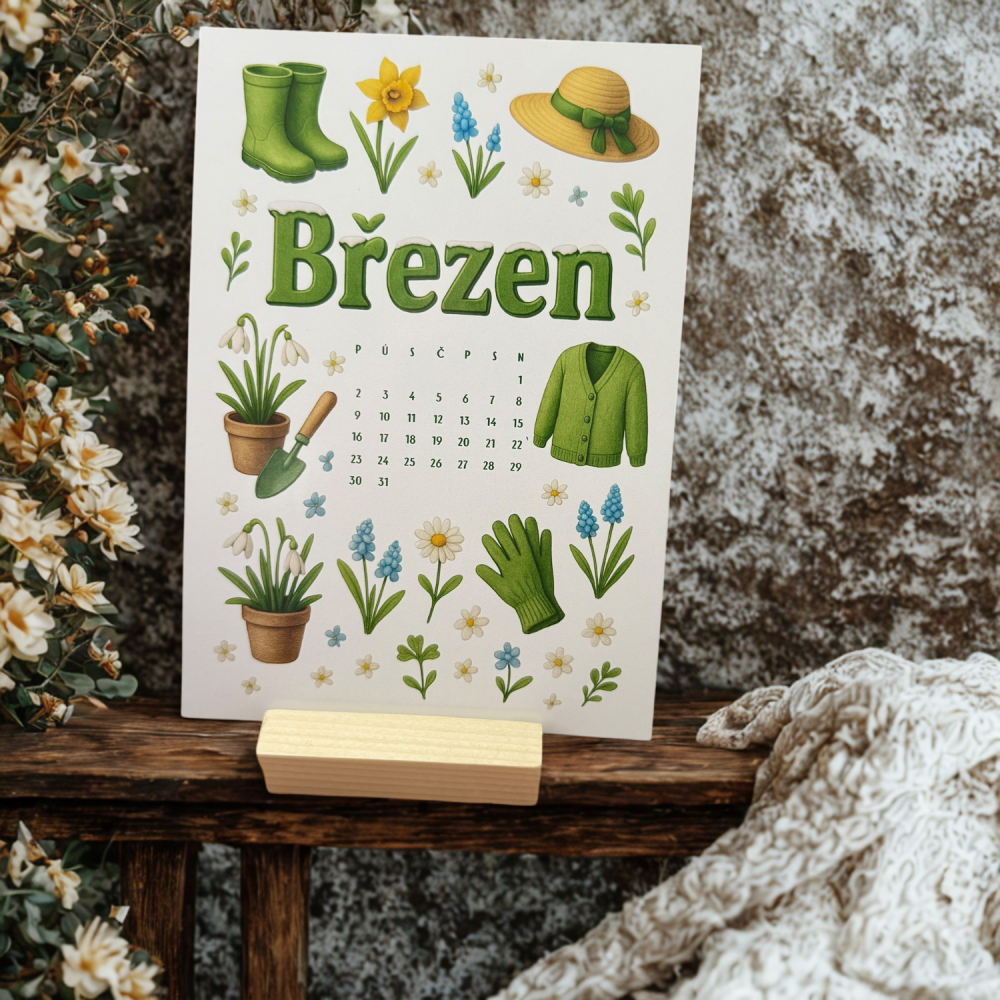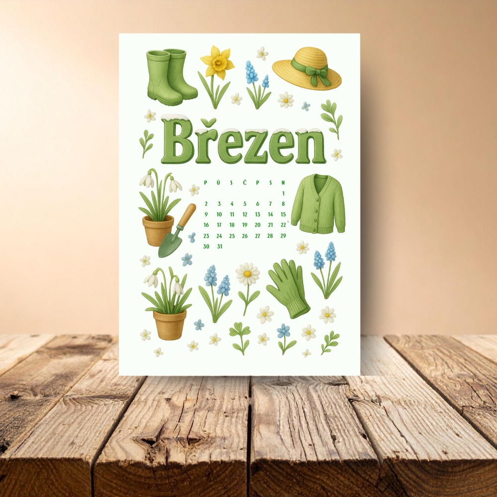 Velký nápis „Březen“ obklopují sněženky, prvosenky, narcisky, zahradní rukavice, lopatka, svetr, klobouk a holínky. Nechybí ani měsíční přehled uprostřed. Vše ladí do zelených a květinových tónů a připomíná, že jaro začíná nejen venku, ale i uvnitř nás. Samolepka působí svěže a čistě – ideální pro nový diářový začátek.
