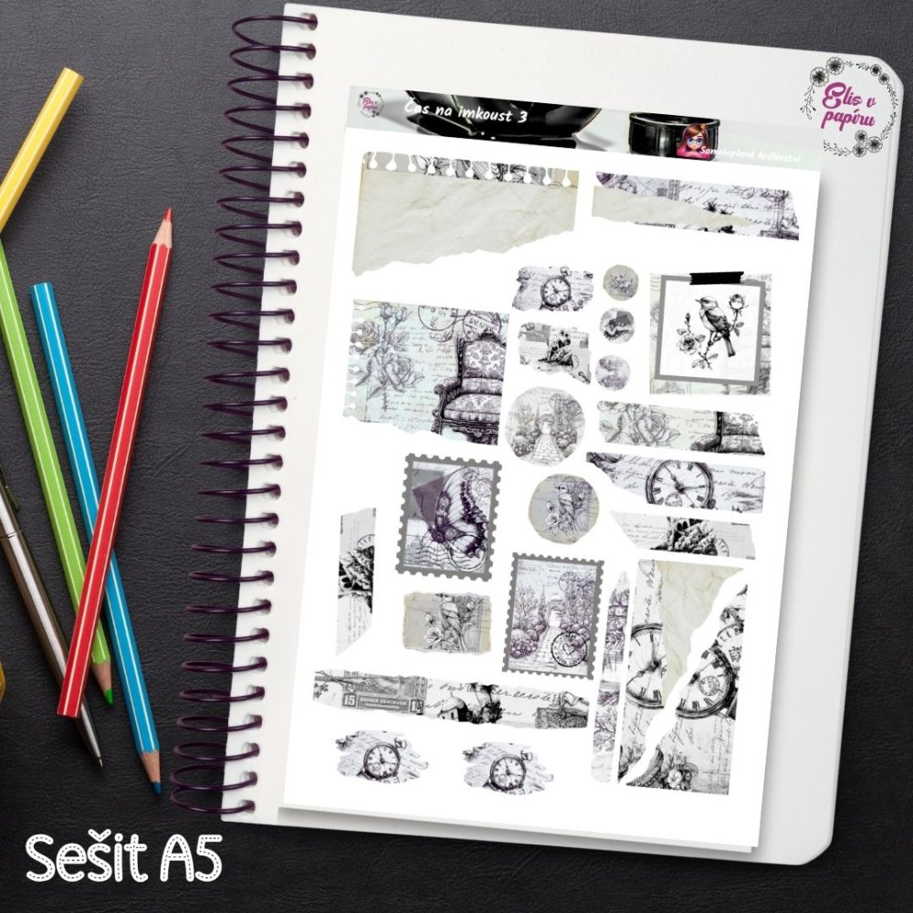 Aršík Čas na inkoust 3 je plný jemných vintage ilustrací – staré hodiny, útržky dopisů, poštovní známky a koláže s poetickým nádechem. Barevná paleta kombinuje černou, šedou a dotek inkoustové fialové, což působí elegantně a nadčasově. Každá samolepka vypadá jako kousek příběhu, který čeká na pokračování. Perfektní pro journaling, bujo i scrapbook, když chceš stránce dodat hloubku a náladu.