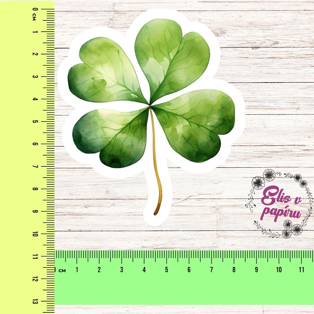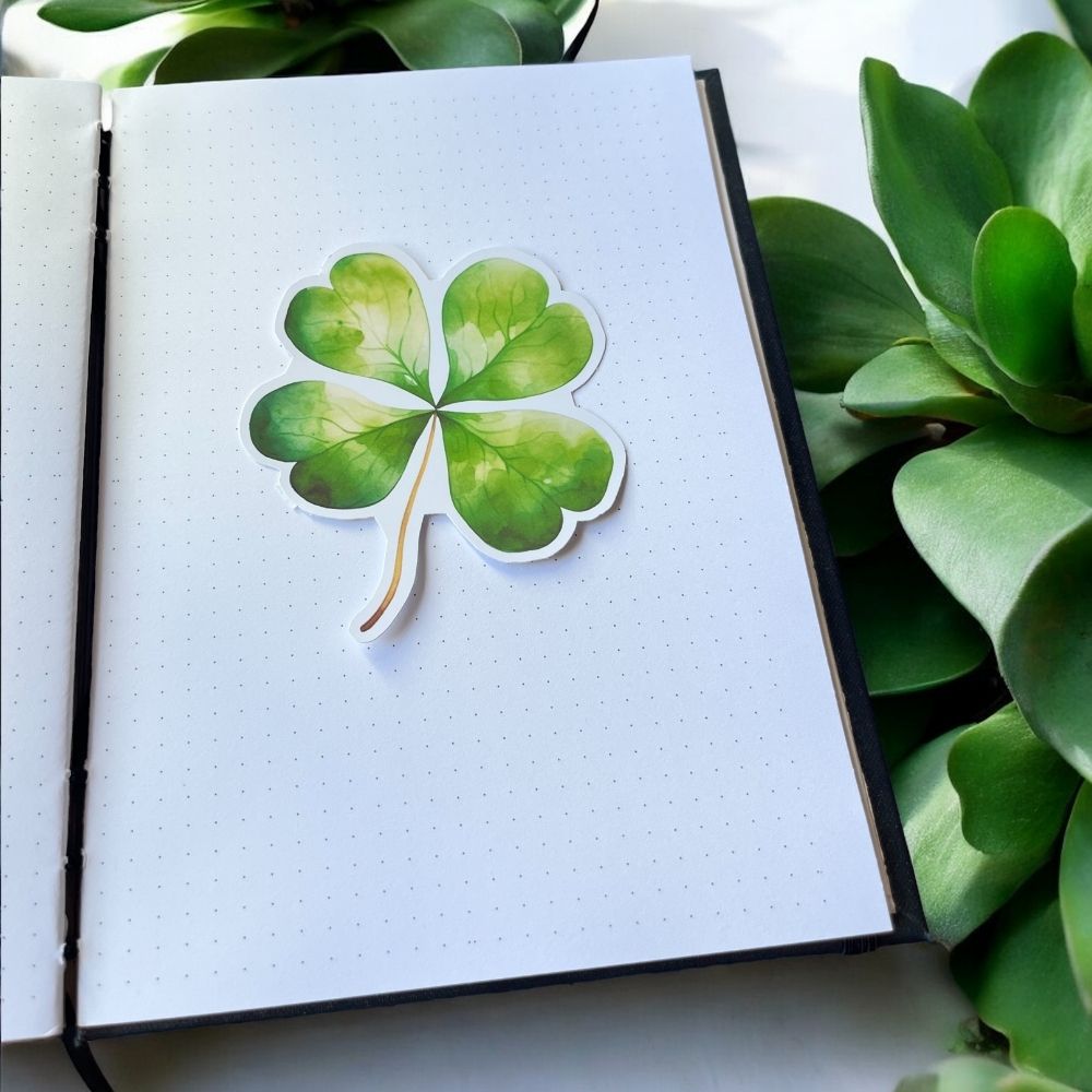 Velký, jemně akvarelový čtyřlístek s výraznými zelenými tóny, bílým konturováním a realistickými listy. Jedna velká samolepka, která se stane dominantou tvé stránky nebo oblíbeným amuletem.