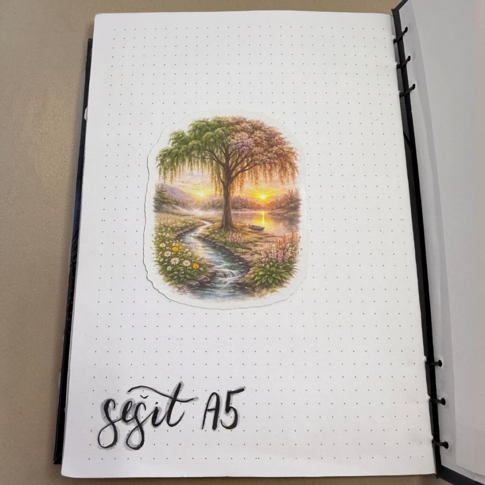 Motiv zachycuje unikátní scénu, kde jeden strom rozděluje krajinu na dvě poloviny – jednu zalitou jemným světlem dne a druhou hřejivými tóny zapadajícího slunce. Klidná voda, která protéká krajinou, propojuje oba světy a vytváří pocit plynutí a návaznosti. Okolí zdobí rozkvetlé květiny, jemná zeleň a teplé i svěží barevné odstíny. Celý motiv působí jako vizuální metafora rovnováhy, proměny a přirozeného rytmu života. Tyhle samolepky do diáře v sobě nesou hloubku i klid zároveň.