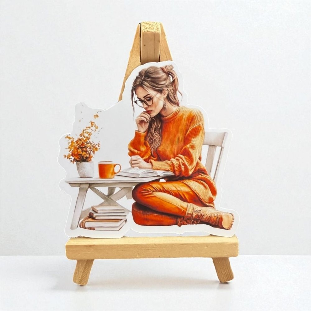 Na téhle samolepce se zastavil čas – dívka v hřejivém svetru sedí s diářem v ruce a kolem ní se rozlévá atmosféra útulného odpočinku. Teplé odstíny oranžové a hnědé barvy působí jako jemné objetí, které uklidní i v rušném dni. Ilustrace působí realisticky a zároveň něžně, jako by tě zvala otevřít diář a na chvíli se ponořit do světa vlastních myšlenek. Tahle velká diářová samolepka je ideální ozdobou pro tvé plánování, journaling i scrapbook.