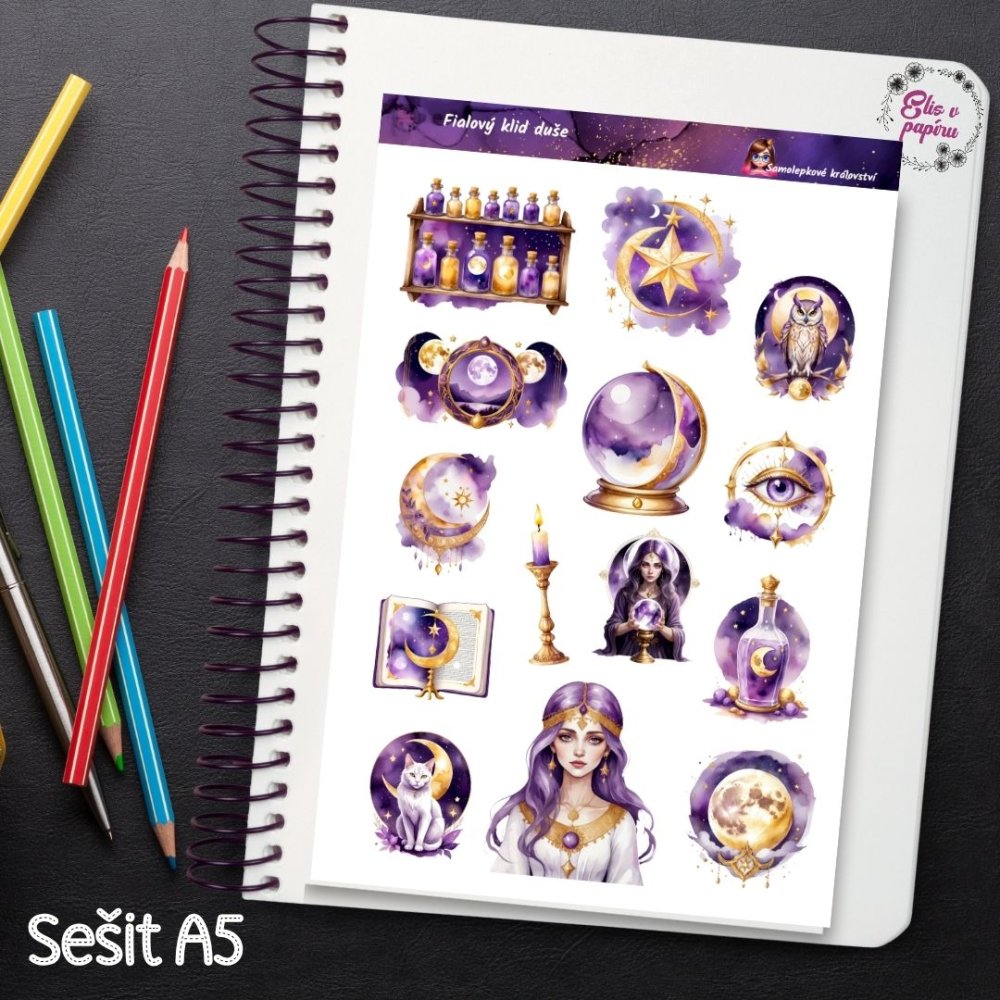 Na tomhle aršíku miluju, jak jemně kombinuje fialovou eleganci s magickou energií ✨🔮. Když je lepím do diáře, připadám si, jako bych si kreslila svůj vlastní noční vesmír plný hvězd. Nejraději je používám v týdnech, kdy chci zpomalit, poslouchat svou intuici a plánovat podle pocitů. Každá koule, svíčka nebo lahvička s elixírem mi připomíná, že i plánování může být rituál. Přidáš si tuhle magii i do svého tvoření?