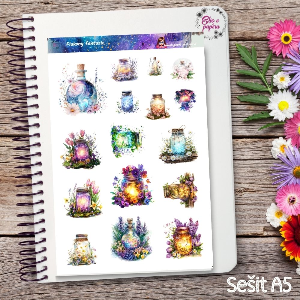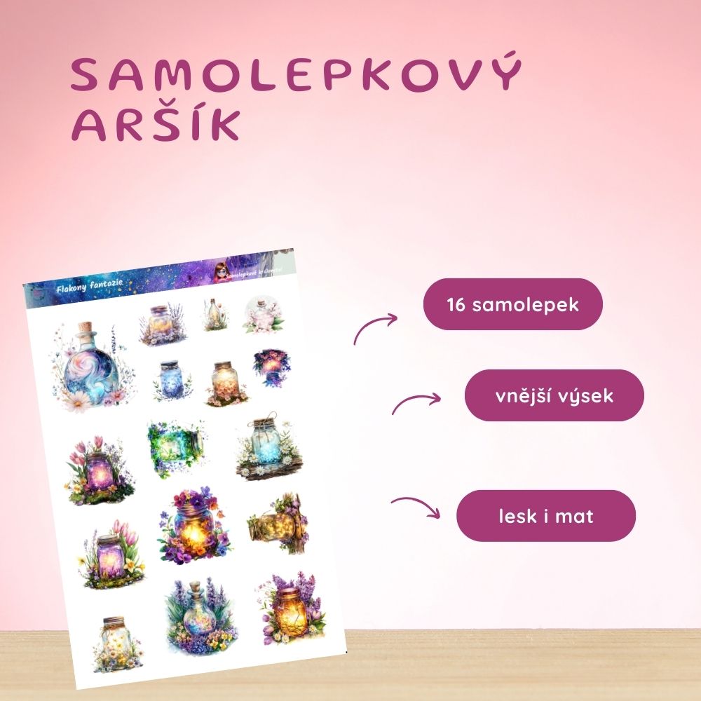 Aršík obsahuje ilustrace kouzelných flakonů, sklenic a lahviček naplněných světélky a barvami. Doplněné jsou květinami, rostlinami a drobnými fantasy detaily. Tyto papírové samolepky jsou ideální jako samolepky na bujo, scrapbook i diářové plánování.