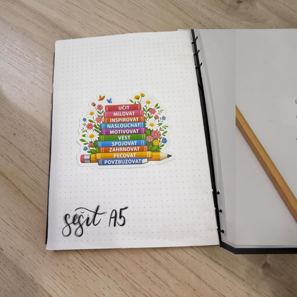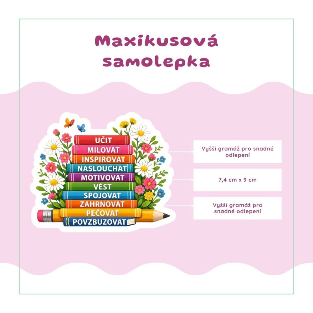 Na tomhle motivu miluju, jak v sobě spojuje něhu květin a sílu slov, která mají opravdový význam. Když se na něj podívám, vidím tiché chvíle s knihou, poznámkami na stole a myšlenkami, které ve mně ještě dlouho doznívají. Každý hřbet knížky tu nese hodnotu, kterou si chci připomínat nejen při čtení, ale i v běžném dni. Je to samolepka, která nepůsobí jen hezky, ale zároveň ve mně otevírá malý vnitřní dialog. Přesně takový, který hladí, povzbudí a vrátí mě k tomu podstatnému. Dokážu si ji představit v diáři, v knize i na místě, kam padne pohled ve správnou chvíli. Nalep si ji tam, kde ti bude dělat radost i tichou společnost.