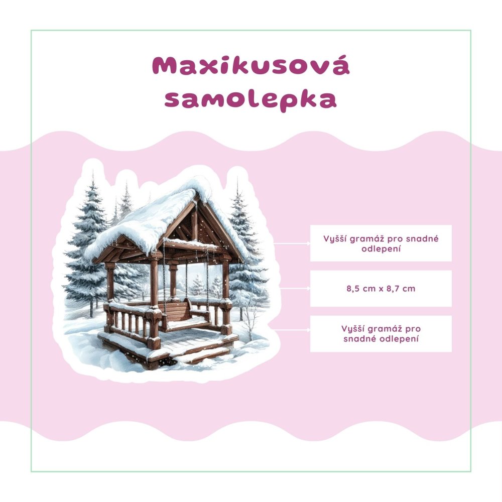 Jednu maxikusuovou samolepku s dřevěnou houpačkou ukrytou pod sněhovou čepicí, obklopenou borovicemi v zasněžené krajině. Styl je jemně realistický s poetickým nádechem – ideální pro tvořivé plánování, zimní journaling nebo sezónní scrapbooking. Působí hřejivě, klidně a vyvolává pocit pohody.