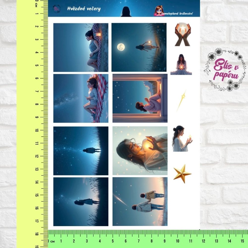 Temně modré tóny noční oblohy se prolínají s měsíčním svitem, hvězdnými drahami a jemnými světelnými odlesky. Každý obrázek vypráví jiný příběh – tiché snění na dece, pozorování měsíce, držení světla v dlaních nebo hledání padajících hvězd. Tyto papírové samolepky promění tvůj diář v prostor, kde se zastaví čas a zůstane jen klid a krása okamžiku.