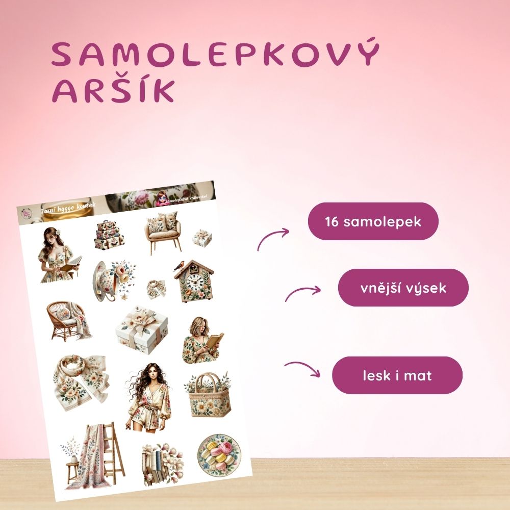 Aršík obsahuje ilustrace knih, květin, dek, křesla, košíků, balíčků a dalších útulných detailů. Tyto papírové samolepky jsou ideální jako samolepky na bujo, scrapbook i diářové plánování.