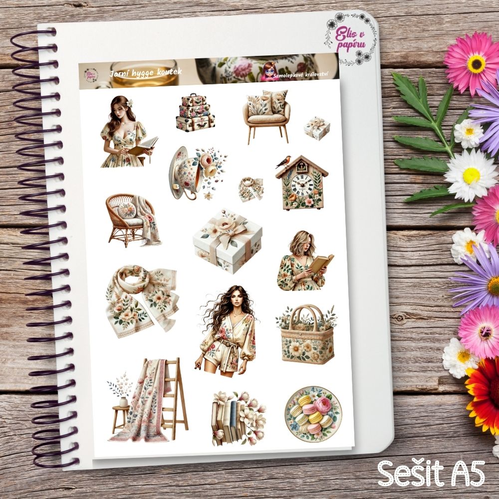 Aršík samolepek do diáře Jarní hygge koutek zachycuje klidné a útulné momenty inspirované jarní atmosférou. Najdeš zde ilustrace knih, dek, květinových doplňků, křesla, košíků, balíčků i drobných dekorací. Tyto diářové samolepky jsou ideální pro journaling, scrapbooking i kreativní plánování. Jemné pastelové barvy a květinové motivy dodávají stránkám harmonickou a klidnou atmosféru.