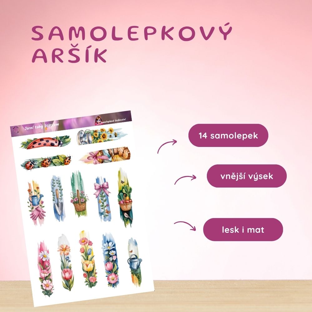 Tenhle aršík je pro mě jako první teplý den, kdy všechno začíná znovu kvést. Miluju ty barvy, jemnost i hravost, kterou v sobě má. Připomíná mi chvíle na zahradě, kdy mám ruce v hlíně a hlavu úplně čistou. Každý motiv je malý střípek radosti, který dokáže rozzářit i obyčejný den. Nejradši ho používám, když chci dodat stránkám svěžest a lehkost. Je to takový malý restart mysli. Zkus si s nimi vytvořit svoje vlastní jarní okamžiky 🌸