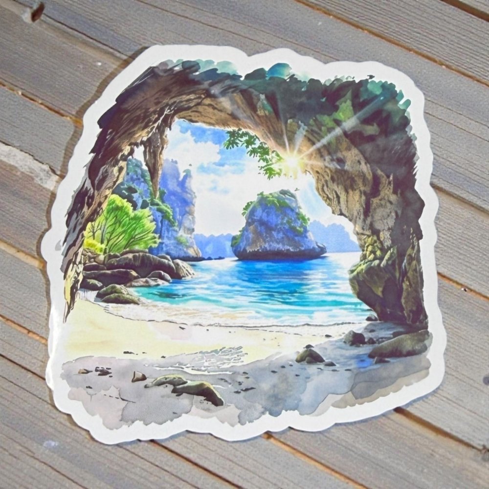 Tahle maxikusuová samolepka je jako tajný průchod k moři – z jeskyně plné stínu vykoukneš do sluncem zalitého ráje. Klidná tyrkysová hladina, ostrůvky, jemný písek a tropické listy vytvářejí atmosféru léta, pohody a volnosti. Každý detail působí jako pohlednice z tvých snů. Ať už plánuješ cestu, nebo si jen potřebuješ odpočinout, tahle papírová pláž ti otevře prostor pro fantazii.