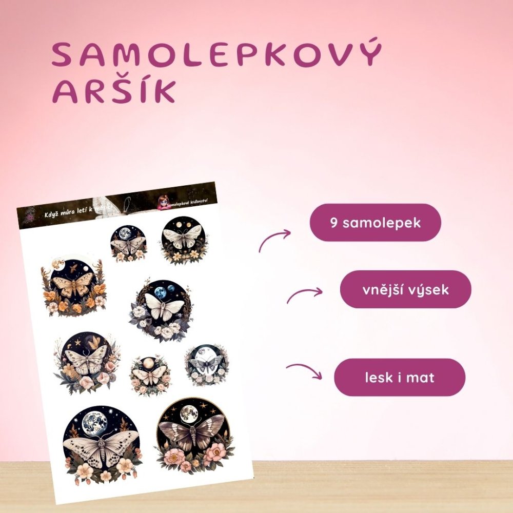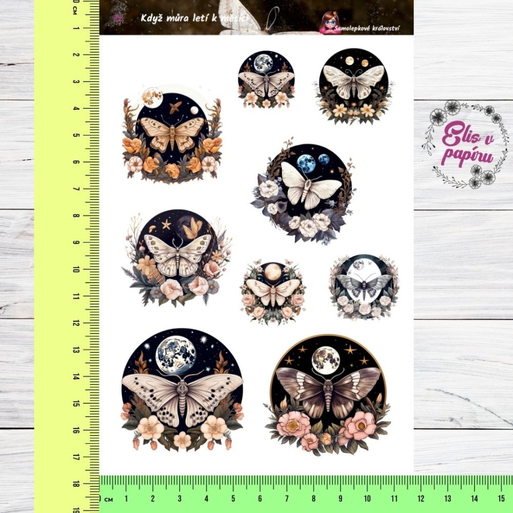 9 papírových samolepek – detailní ilustrace můr s květinovými rámečky, měsíci a hvězdnou oblohou. Jemný akvarelový styl s důrazem na estetické detaily a harmonii barev.