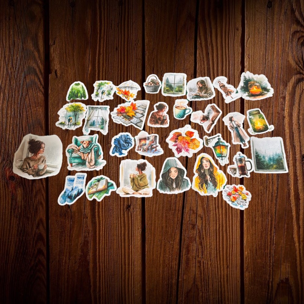 Sada Když venku prší přináší 30 velkých samolepek, které jako by vypadly z podzimního filmu – dívky u okna, knížky, hrníčky s čajem, zamlžená skla, lucerny a listí na mokré dlažbě.