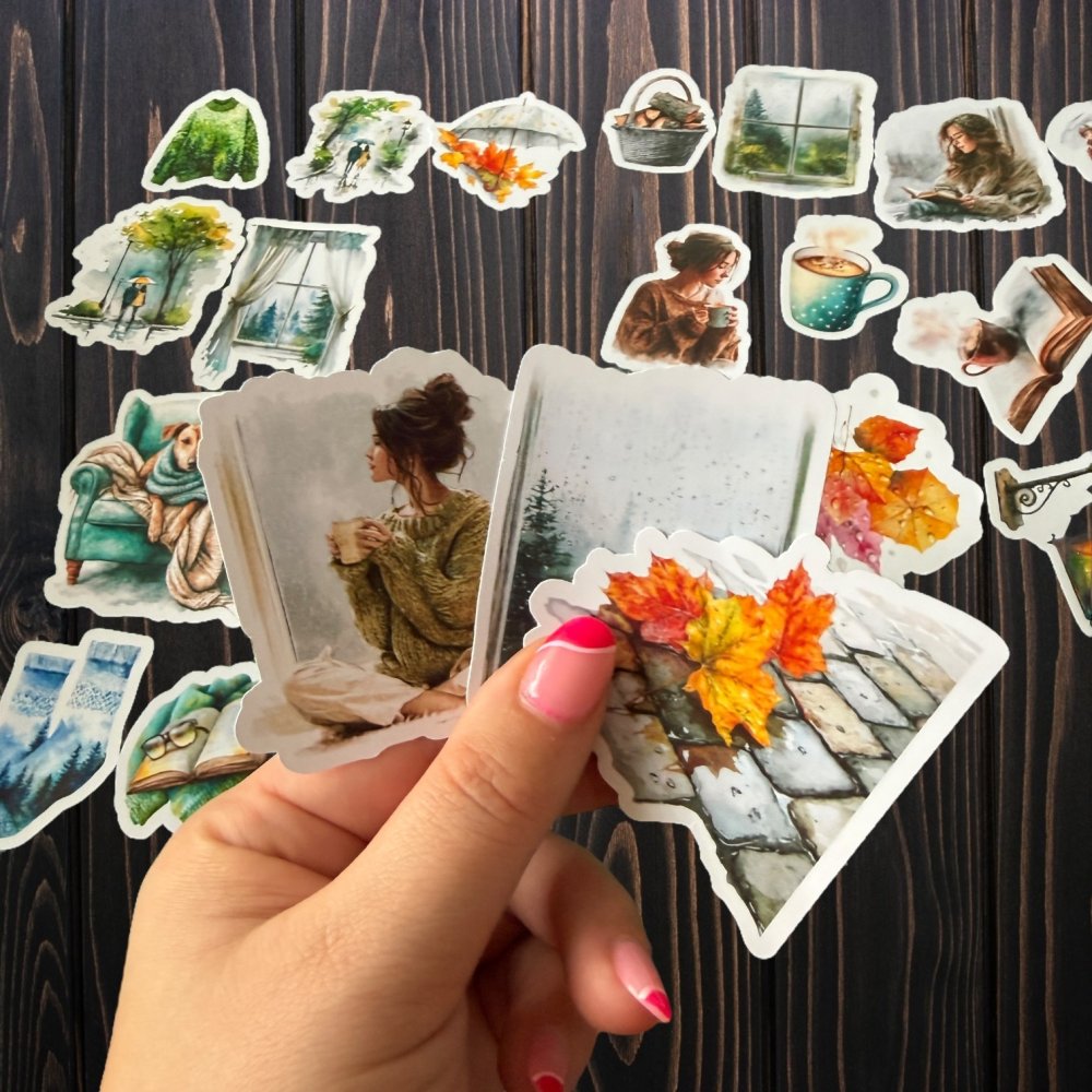 30 samolepek s ilustracemi podzimních scén: dívky u okna, knížky, deštníky, lucerny, listí, šálky, pohledy z okna.