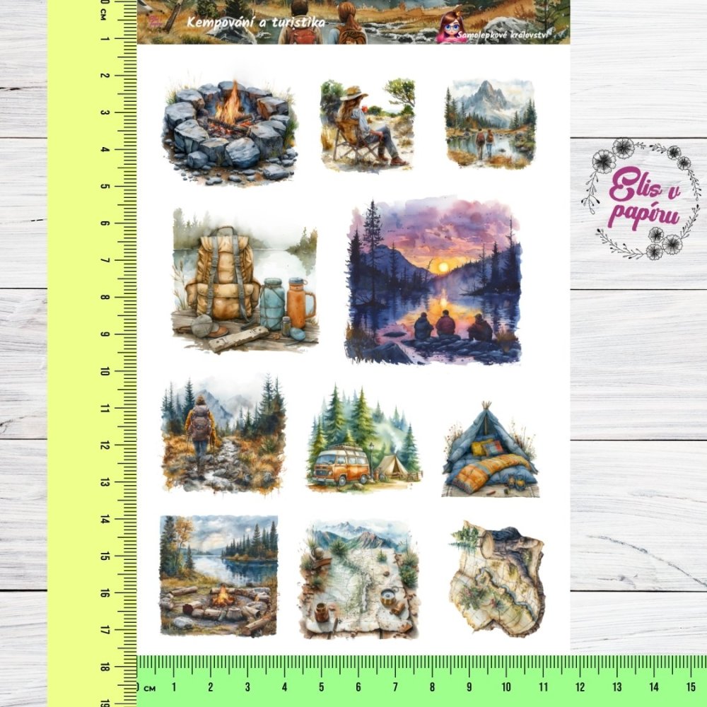 Aršík „Kempování a turistika“ tě zavede do hlubokých lesů, na břeh horského jezera i k večernímu táboráku pod oblohou plnou hvězd. Ilustrace mají jemně realistický akvarelový styl a dýchají tichem přírody. V batohu najdeš termosku, mapy, zápisník i ešus. Tahle sada tě obejme pocitem svobody, jednoduchosti a přítomného okamžiku – takového, který si chceš nalepit do deníku i do srdce.