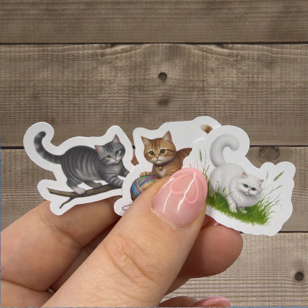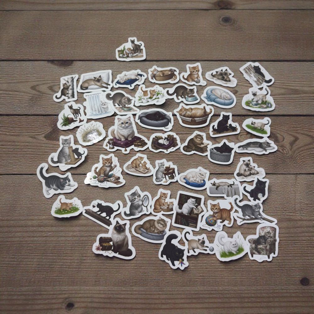 Najdeš tu celkem 47 samostatných kočičích samolepek v různých pózách a situacích. Kočky spí, hrají si, sedí mezi knihami nebo v trávě. Styl je jemný, realistický a laděný do přírodních barev. Ideální samolepky na scrapbook i plánování.
