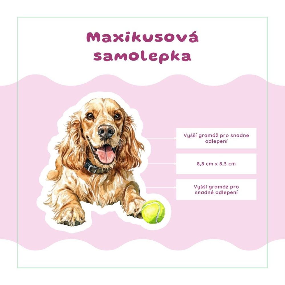 Najdeš jednu větší ilustraci kokršpaněla s míčkem v jemném realistickém stylu. Barvy jsou teplé, přírodní a doplněné svěžím zeleným akcentem. Tyto papírové samolepky působí živě a přirozeně, ideální jako výrazný prvek do každého projektu.
