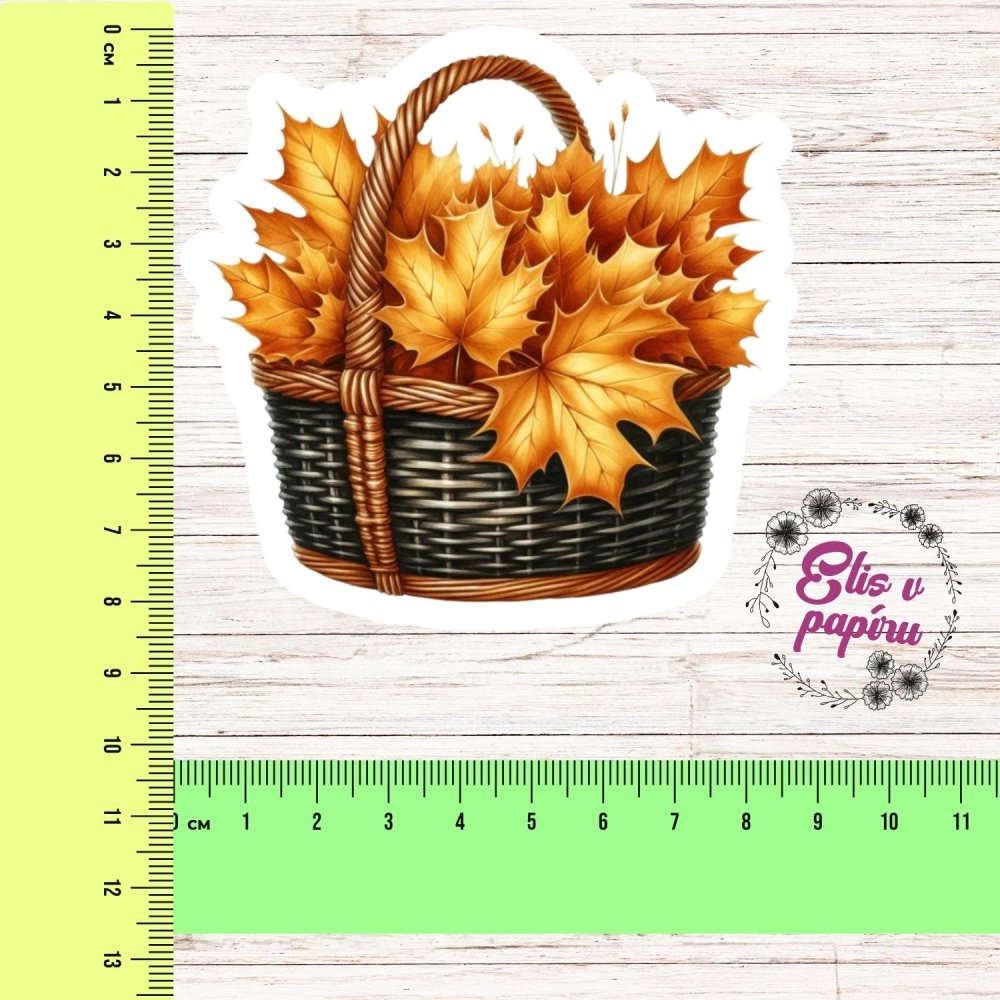 Ilustrace proutěného košíku naplněného javorovými listy v odstínech žluté, oranžové a hnědé. Styl je teplý, realistický, s jemným 3D efektem, který zaujme na první pohled. Výrazný, ale zároveň jemný prvek pro každodenní tvoření.