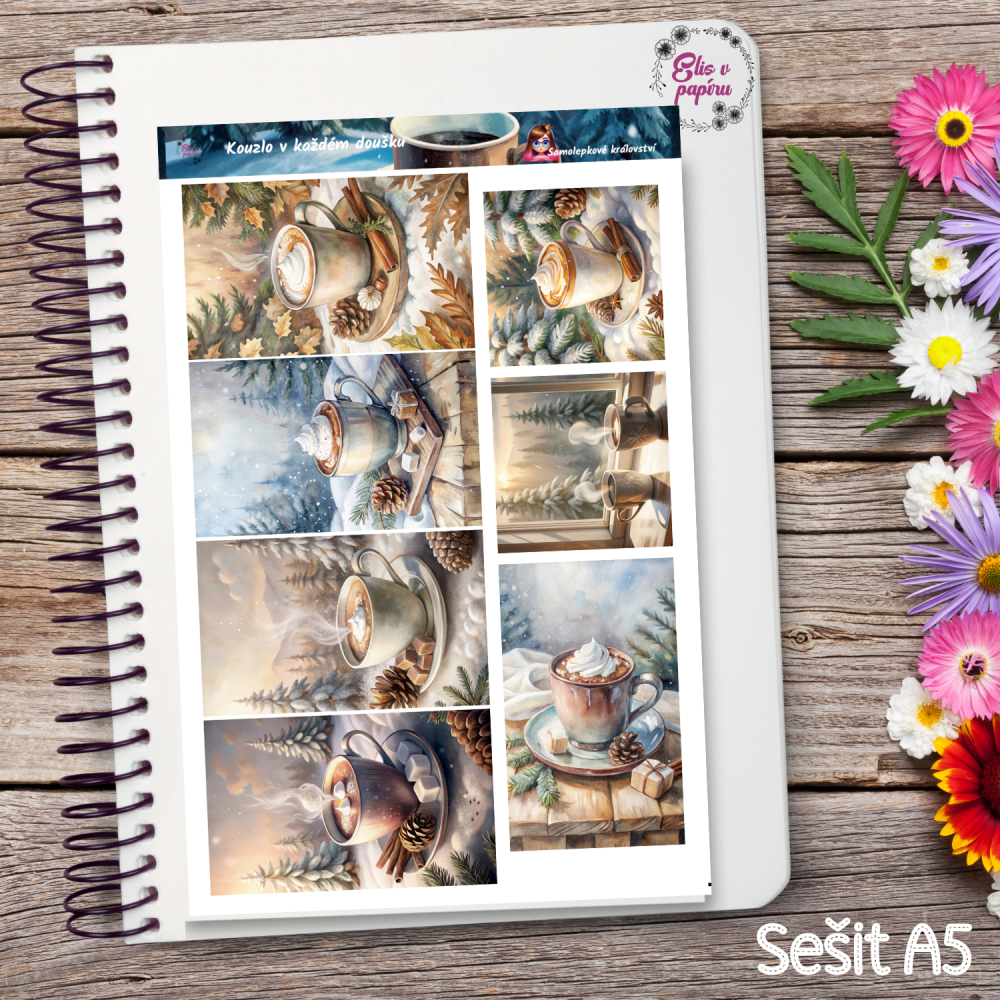 V zimě mě vždycky nejvíc baví ty chvíle, kdy si sednu k diáři s teplým nápojem – tohle spojení mě doslova dobíjí. 🔥 A právě tenhle aršík je vizuální podoba těch momentů: páry z hrnku, dřevěný tác, zasněžené okno v pozadí… Miluju ho lepit do journalingových dnů nebo k zápiskům o vděčnosti. Připomíná mi, že i maličkosti mají sílu měnit náladu. Zkus si ho nalepit tam, kde si přeješ klid, teplo a vděčnost v šálku.