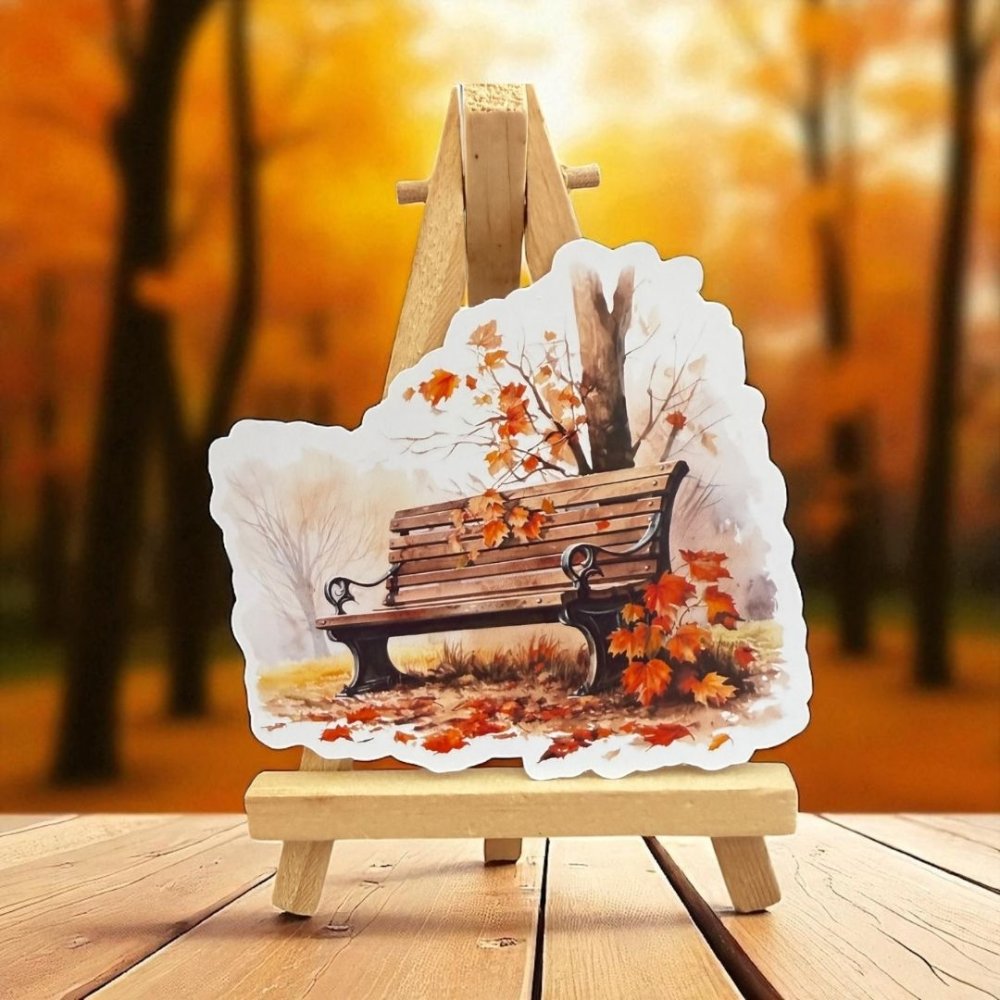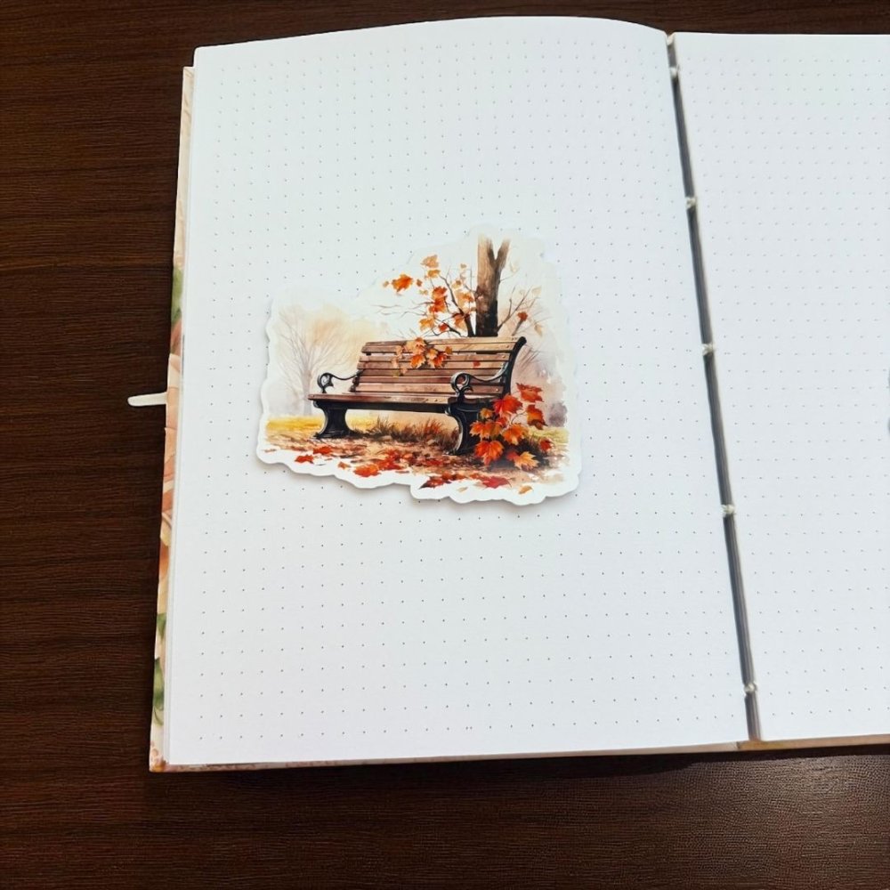 Jednu velkou papírovou samolepku s lavičkou mezi spadanými listy. Ilustrace je laděná do podzimních odstínů, s jemným akvarelovým nádechem. Krásně doplní stránky, kde chceš vyjádřit klid a nostalgii.