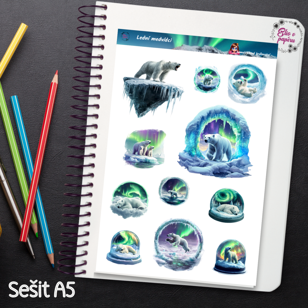 11 samolepek s motivy ledních medvědů – v páru, s mládětem, sami na kře i uvnitř ledové jeskyně. Nechybí polární záře, sněhové koule a zasněžená tundra. Ilustrace mají realistický, ale snový styl – kombinace studených modrých a zelených tónů působí uklidňujícím dojmem.