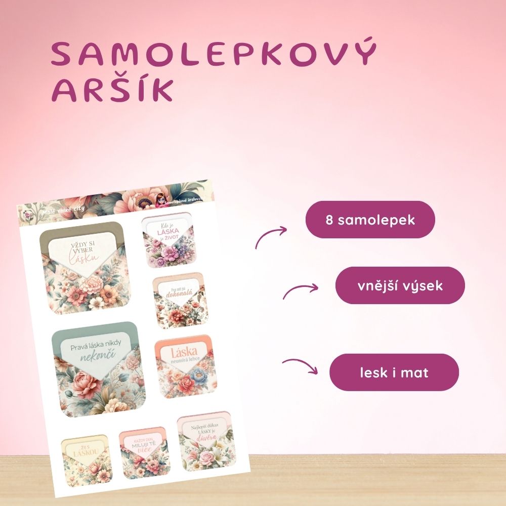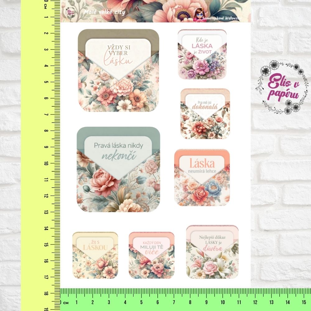 Najdeš tu květinové kompozice doplněné o citáty a krátké texty o lásce. Motivy jsou jemné, romantické a elegantní. Tyto samolepky do diáře krásně doplní diářové samolepky i samolepky na bujo. Skvěle fungují i jako papírové samolepky na scrapbook.