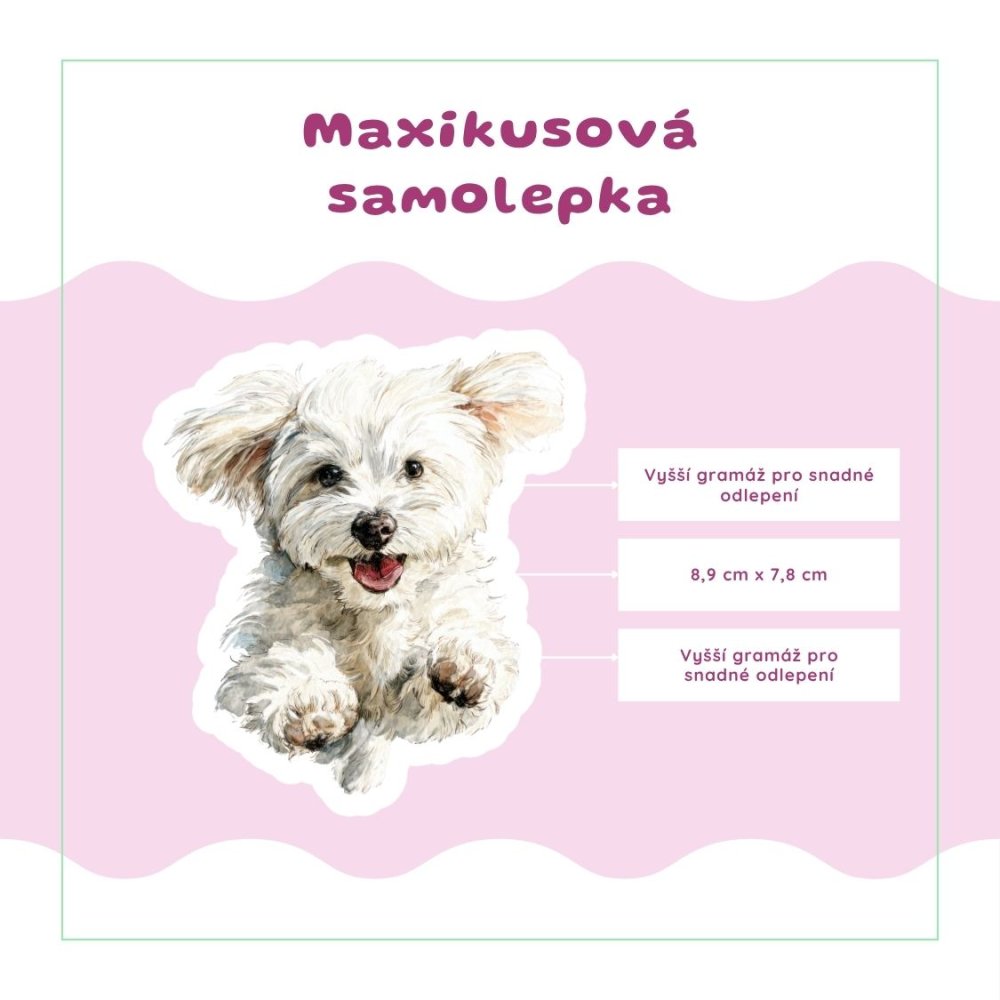 Najdeš jednu větší ilustraci maltézáčka v jemném realistickém stylu. Převládají světlé, bílé a krémové tóny s decentními detaily. Tyto papírové samolepky krásně vyniknou jako hlavní motiv na stránce.