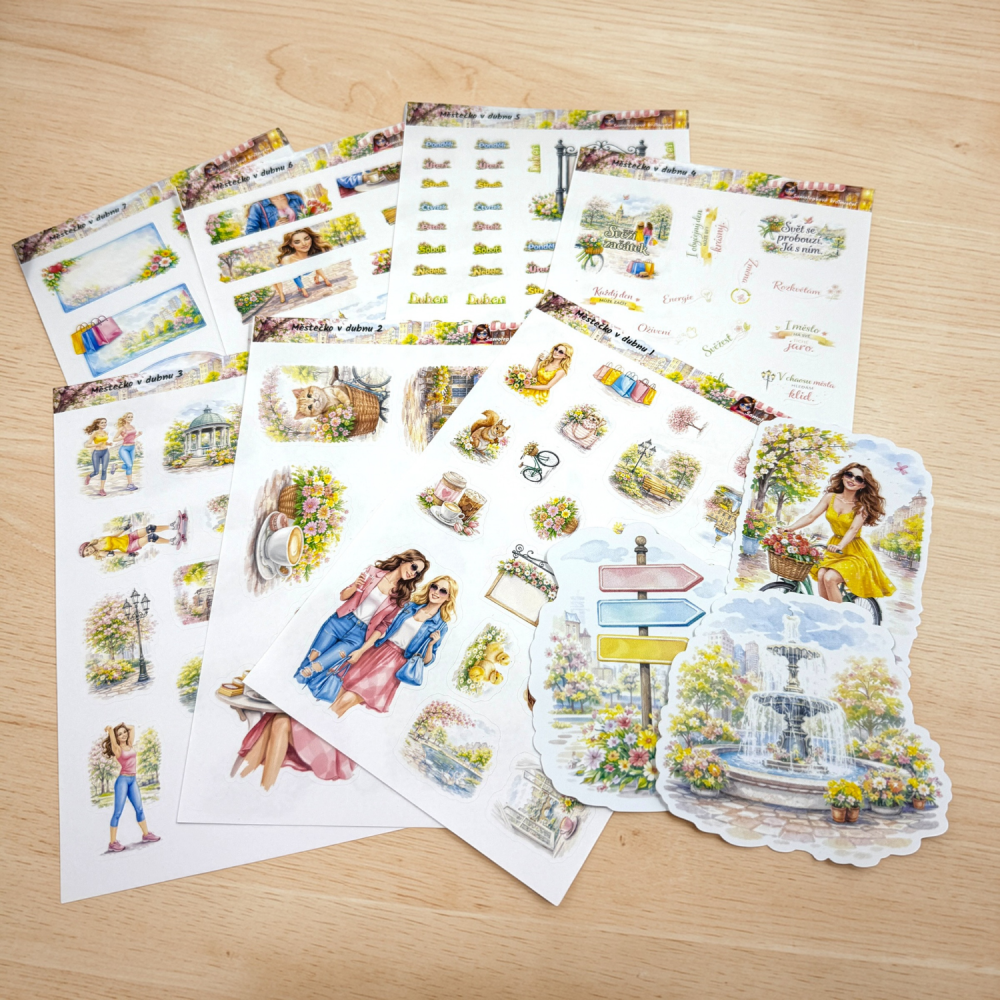 Dubnové městečko je pro mě symbolem nových začátků 🌷. Miluju tu kombinaci rozkvetlých stromů, kávy na zahrádce a ženské energie, která z těch ilustrací úplně dýchá. Nejradši si tyhle samolepky na bujo lepím na začátek týdne, kdy si plánuju malé radosti – procházku, kafe s kamarádkou, čas jen pro sebe. Vždycky mám pocit, že i obyčejné úterý může být malý svátek. Jednou jsem si s nimi vytvořila celý „self-care“ týden a pokaždé, když otevřu diář, vrátí mě to do té atmosféry. Zkus si s nimi vytvořit svůj vlastní jarní rituál 💛.