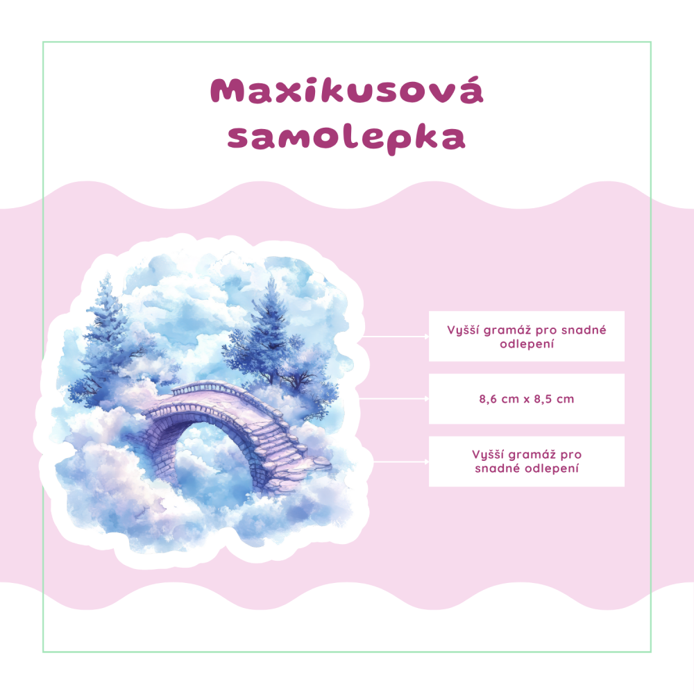 Kamenný most bez začátku a konce, ponořený v obláčcích, lemovaný zasněženými stromy. Motiv je zpracovaný v jemném, mlžném akvarelu s nádechem tajemna. Samolepka je vyřezaná podle tvaru ilustrace a vytištěná na kvalitním papíře s vyšší gramáží – krásně drží tvar a snadno se odlepuje.