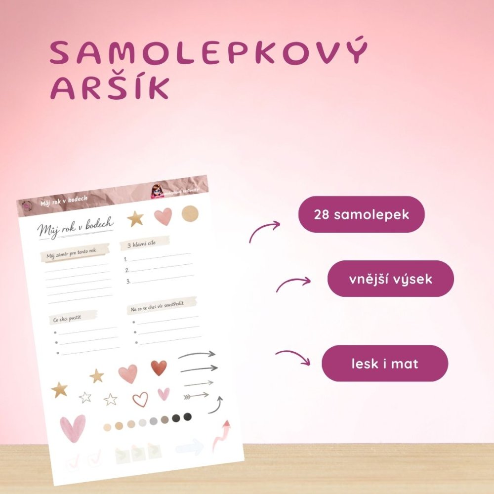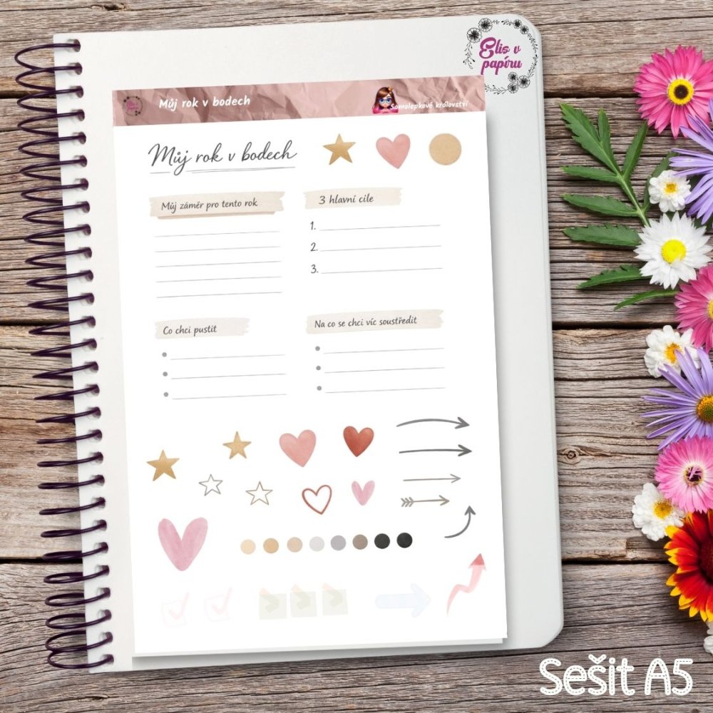 Začít nový rok není o dokonalosti, ale o směru ✨. Tenhle aršík mi pomáhá dát si v hlavě i na papíře jasno – co si přeju, kam směřuju, co už se mnou dál nepůjde. Lepím si ho do journálu nebo na nástěnku jako malý vizuální kompas. Každá šipka, každý bod, každé srdíčko mi připomíná, že můžu plánovat vědomě i jemně. Dopřej si taky prostor pro svoje proč – a začni v bodech.