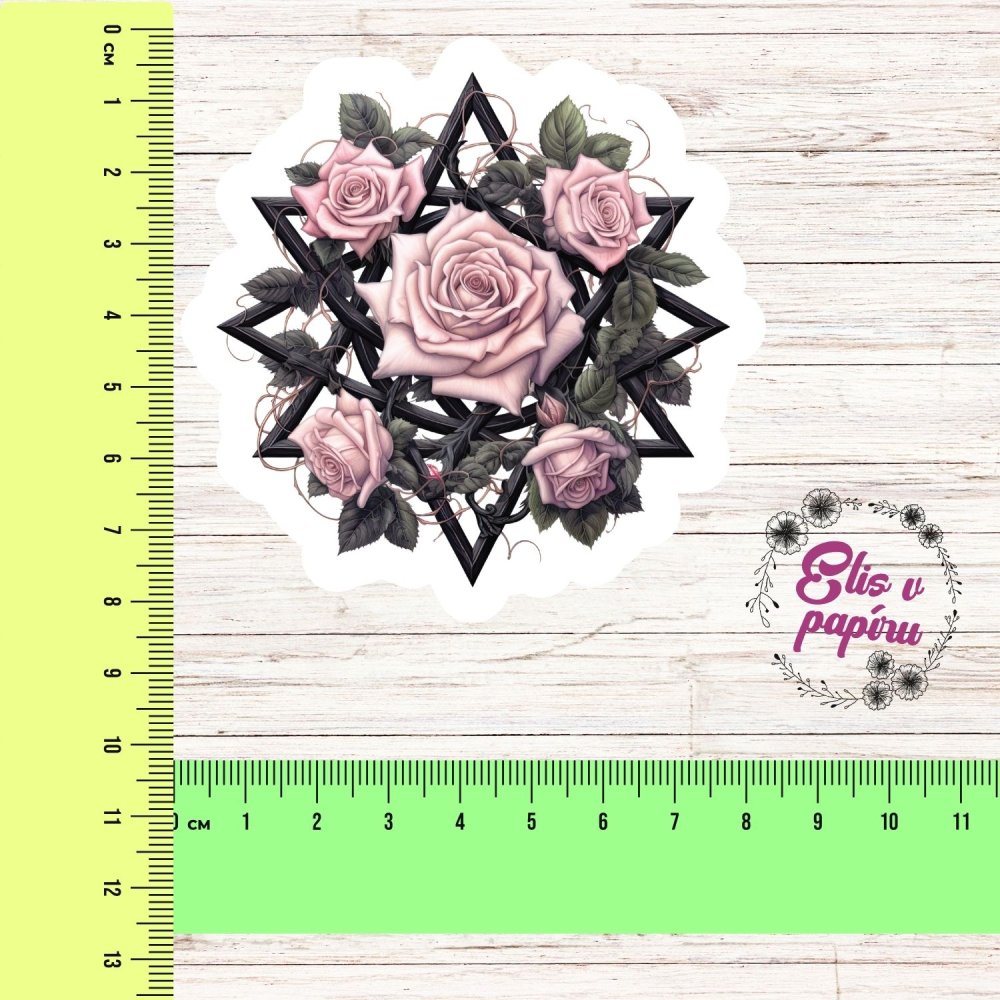 Elegantní samolepka s motivem něžných růžových růží propletených temně černou geometrickou hvězdou. Symbolika propojení krásy a tajemství, síly a jemnosti. Růže jsou propracované do detailu, listy i trny obepínají ostré hrany hvězdy – a vytvářejí fascinující kontrast.