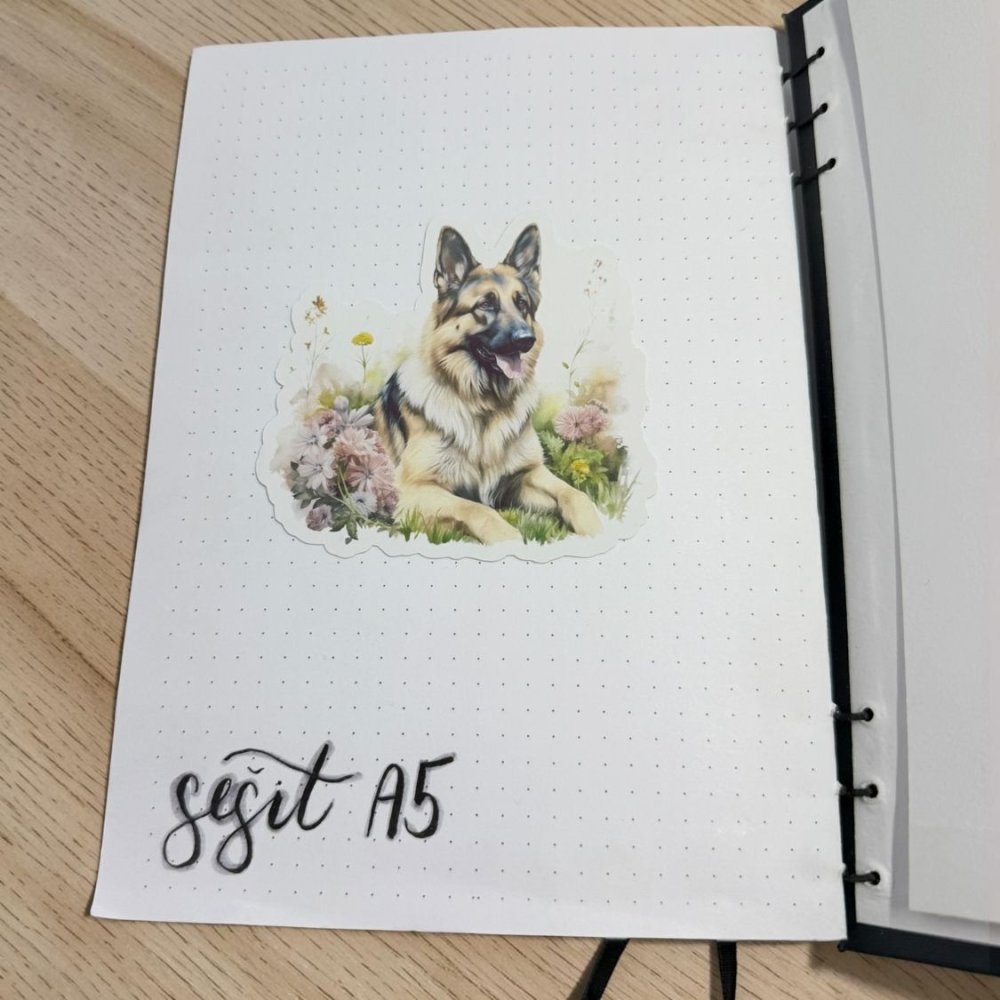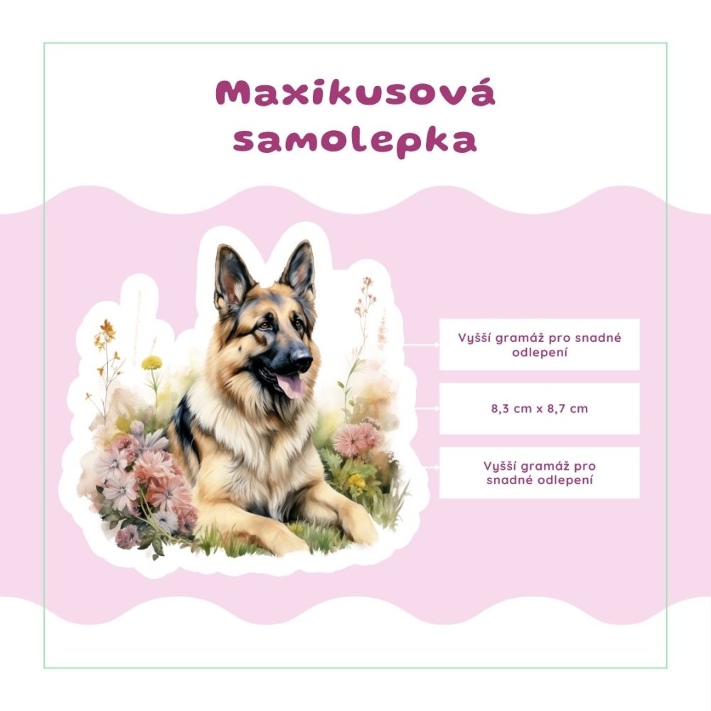 Najdeš německého ovčáka ležícího mezi jemnými květinami v pastelových barvách. Styl je realistický, ale zároveň něžný a dekorativní. Tyto papírové samolepky krásně doplní samolepky do diáře i kreativní tvoření.