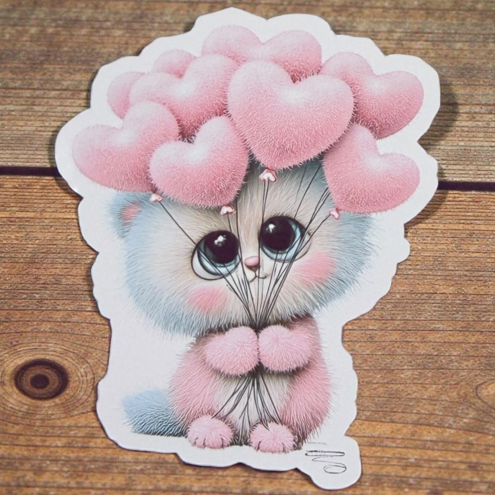 Jedno roztomilé koťátko s obřím pohledem držící svazek balónků ve tvaru růžových srdcí. Detailně propracovaná digitální ilustrace ve stylu „cute overload“, jemné chloupky, pastelové tóny a blyštivé oči. Maxiformát umožňuje vyniknout i nejmenším detailům – je to jako papírový plyšák.