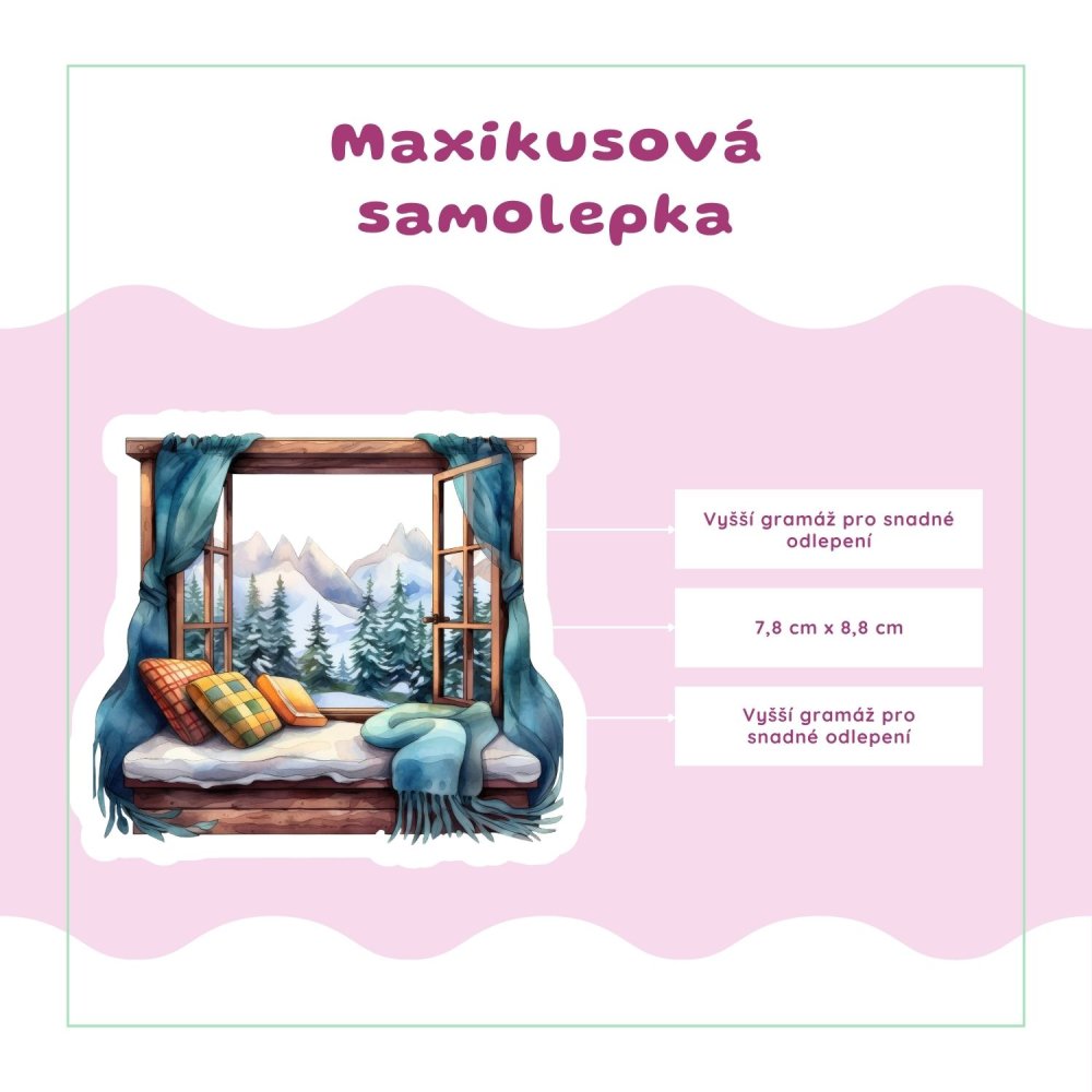 Jedna maxikusuová samolepka s otevřeným oknem do zasněžené krajiny, horami a lesem v dálce. V popředí je dřevěné parapetní sezení s dekami, polštáři a hřejivou barevností. Styl je jemně realistický, lehce akvarelový, a působí jako vizuální náruč. Ideální pro zimní journaling, plánování i duši, která potřebuje zvolnit.