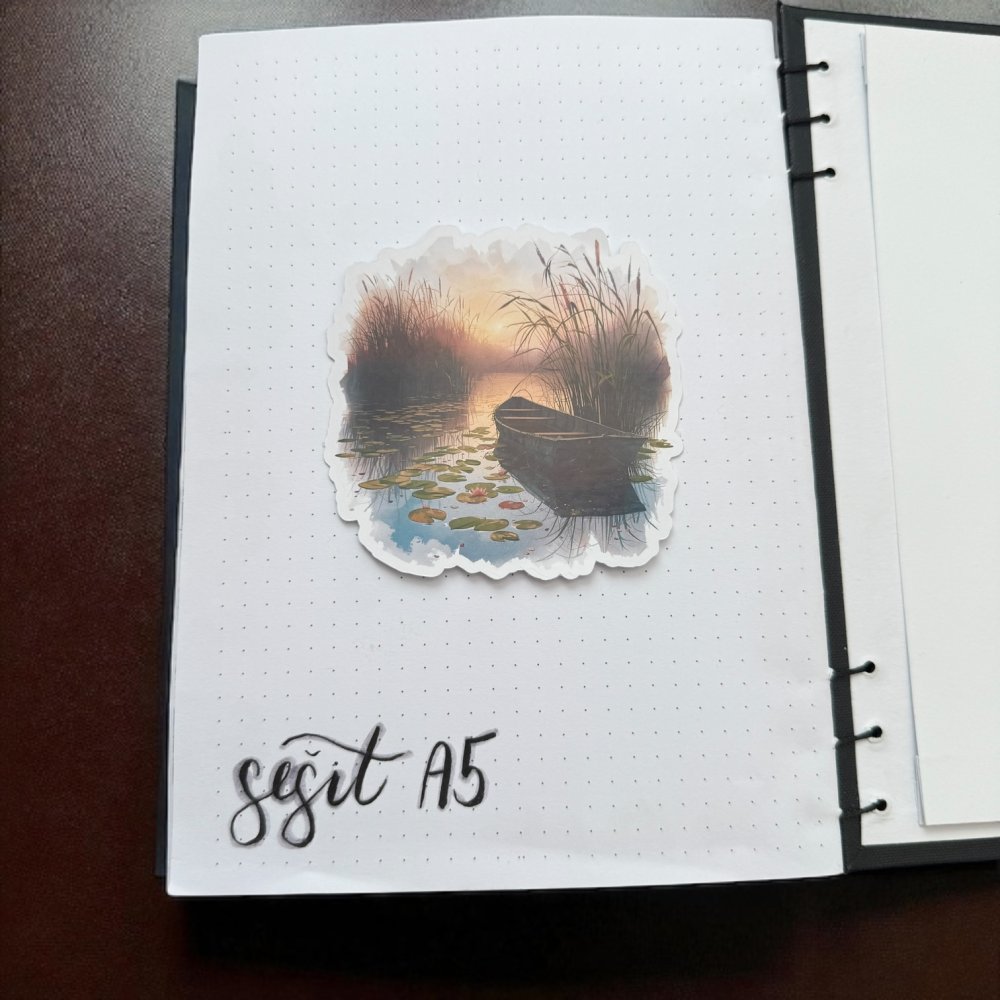 Na této samolepce je zachycena loďka schovaná v rákosí, obklopená klidnou vodní hladinou posetou lekníny. Teplé tóny západu slunce se mísí s jemnou mlhou, která scéně dodává hloubku a melancholii. Jemný malířský styl působí poeticky a uklidňujícím dojmem – ideální pro plánování s klidem v duši.