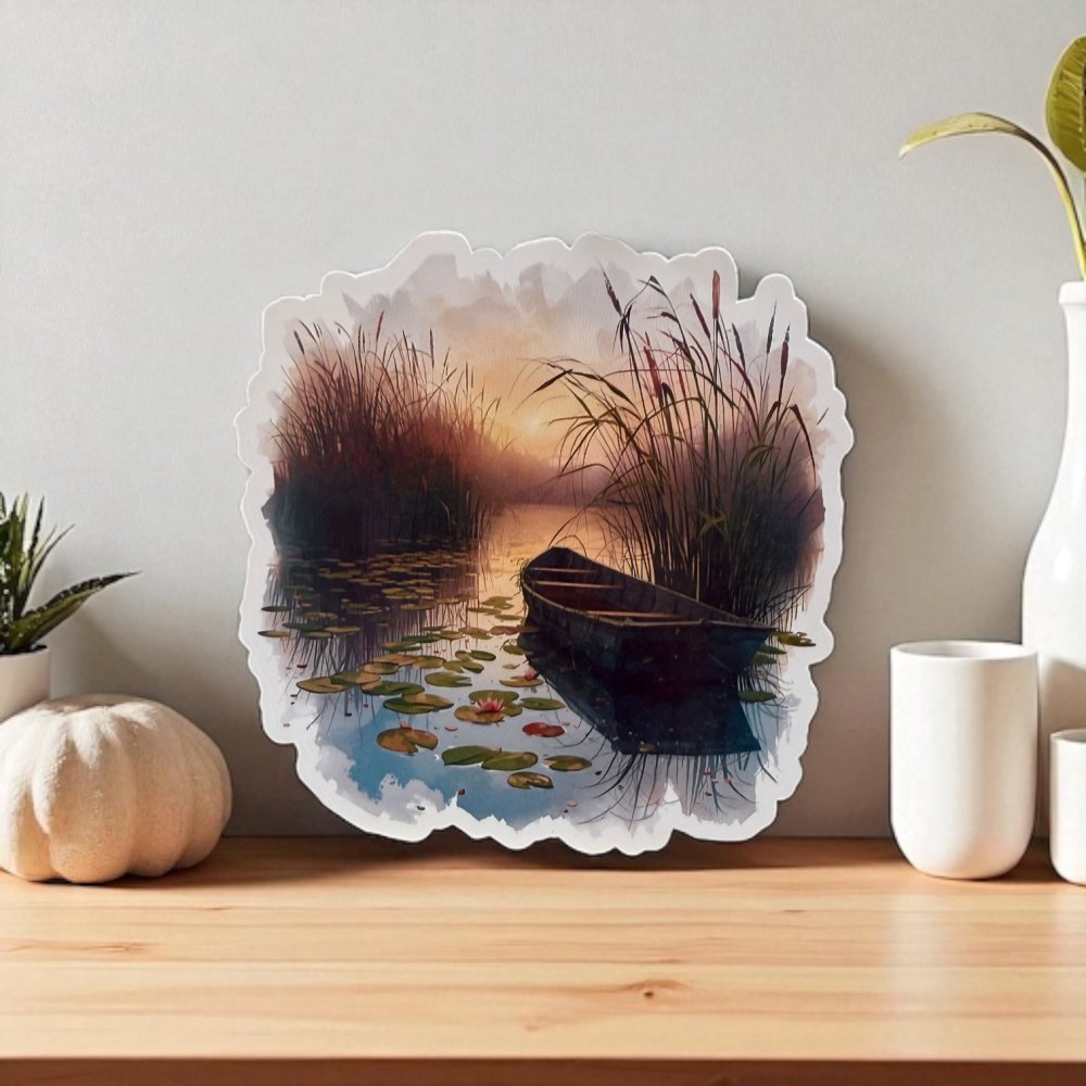 Jednu samolepku s motivem loďky mezi rákosím při západu slunce. Jemný akvarelový styl, měkké přechody barev a realistické detaily vodní hladiny.