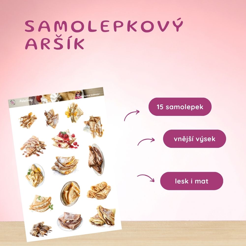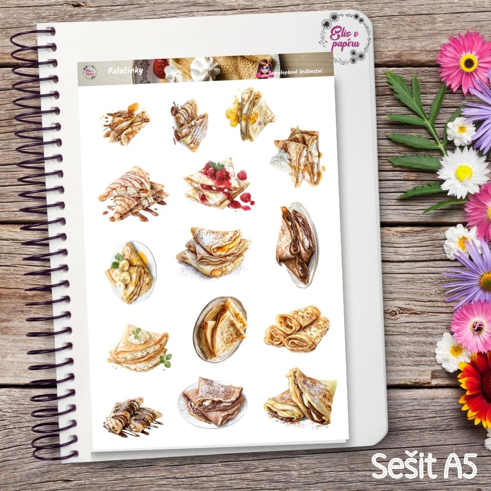 Najdeš tu palačinky s čokoládou, ovocem, cukrem i na talíři v různých variantách. Motivy jsou realistické, jemné a velmi chutně zpracované. Tyto samolepky do diáře krásně doplní diářové samolepky i samolepky na bujo. Skvěle se hodí i jako papírové samolepky na scrapbook.