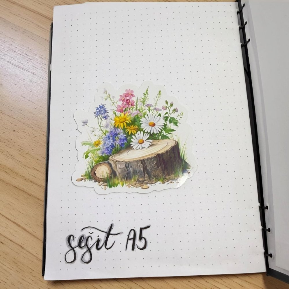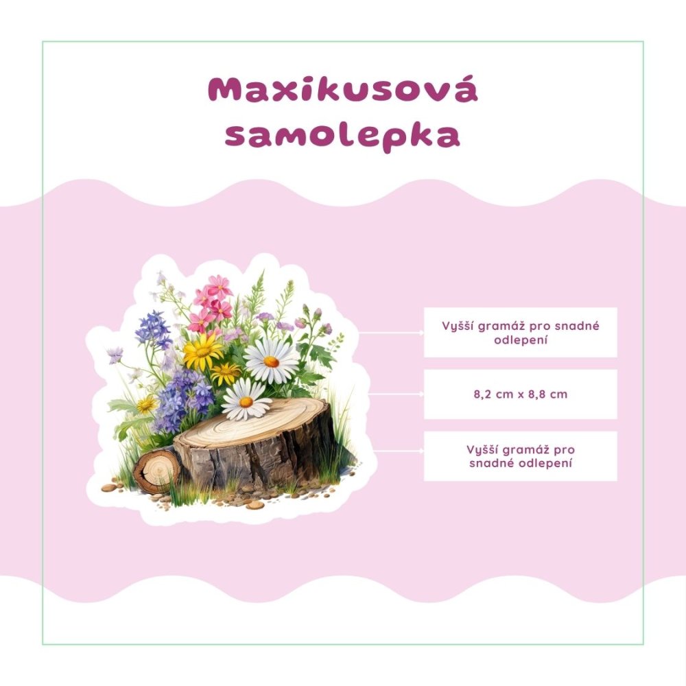 Motiv zachycuje dřevěný pařez obklopený pestrými lučními květy. Barevnost je svěží, jemná a přirozená, takže celý motiv působí lehce a radostně. V kombinaci dřeva, květin a zeleně je cítit klid přírody i tichá obnova. Tyto papírové samolepky přinesou do plánování něhu, svěžest a pocit nového začátku. Krásně vyniknou na stránkách, které si chceš ozdobit něčím jemným a živým.