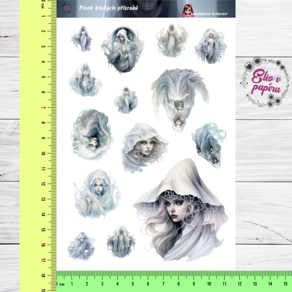 Najdeš 14 samolepek s bledými postavami, duchy, éterickými ženami v pláštích a mlhavými obličeji. Styl je jemný, zasněný, s nádechem starých legend. Tyto papírové samolepky jsou jako obraz duchovního světa – tichý, ale silný.