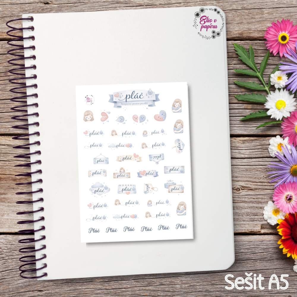 Aršík obsahuje nápisy „pláč“, ilustrace slz, srdcí, obláčků, kapesníků a postav v objetí. Styl je jemný, podpůrný a laskavý. Motivy spolu ladí a nepůsobí tíživě. Tyto české samolepky jsou vhodné pro bujo, diář i terapeutické psaní.