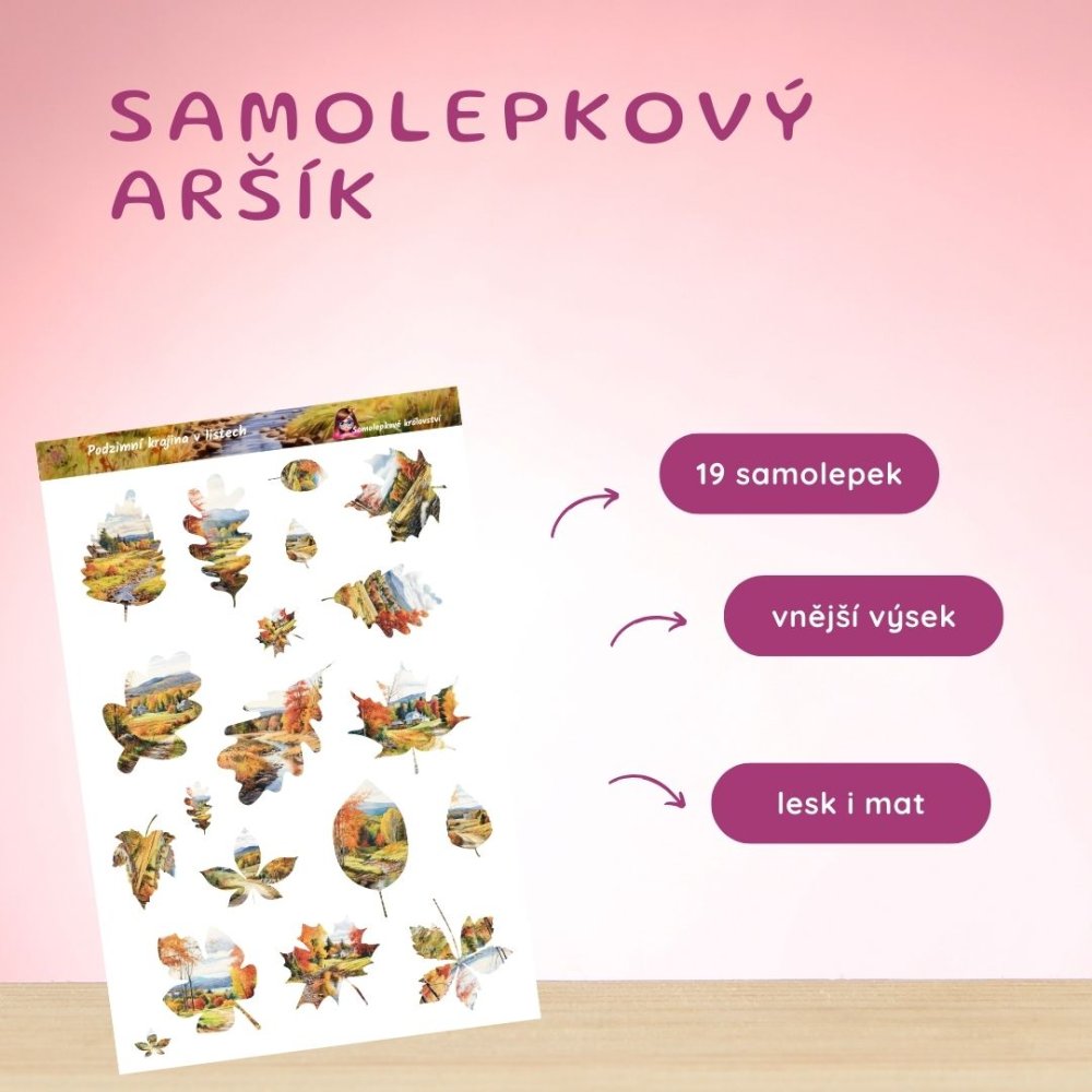 Aršík je originální propojení podzimního listí a malovaných krajin. Každý list skrývá jiný pohled na přírodu – stromy, louky, cesty i podzimní horizonty. Jemné barvy evokují klid, nostalgii i radost z procházek.