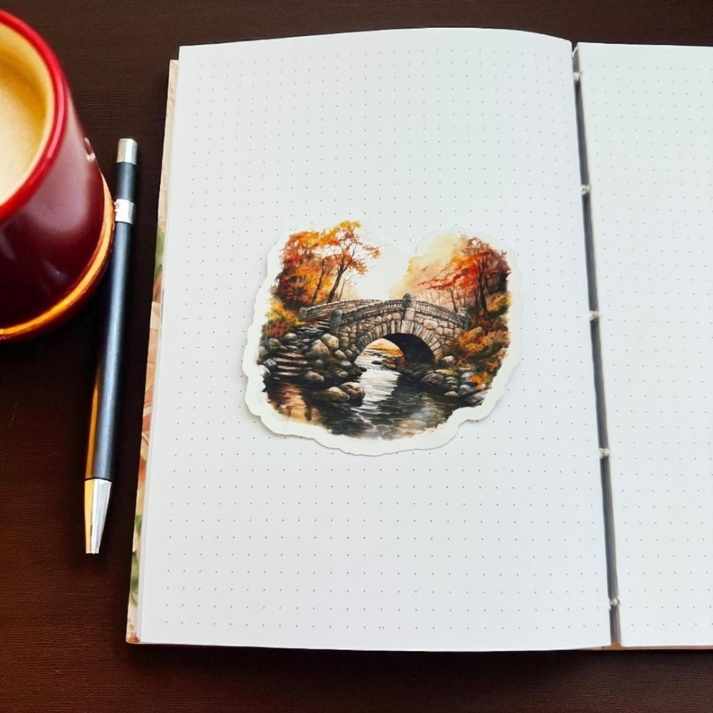Ilustrace kamenného mostu uprostřed barevného lesa tě vtáhne do atmosféry tichého podzimu. Zlaté, červené a hnědé tóny listí kontrastují s šedí kamene i odlesky vody pod mostem. Celý obrázek působí jemně akvarelově a zároveň velmi detailně – jako malý obraz přímo v diáři. Tohle není jen samolepka, je to zastavení v čase, které vnese do tvého plánování klid i poetiku.