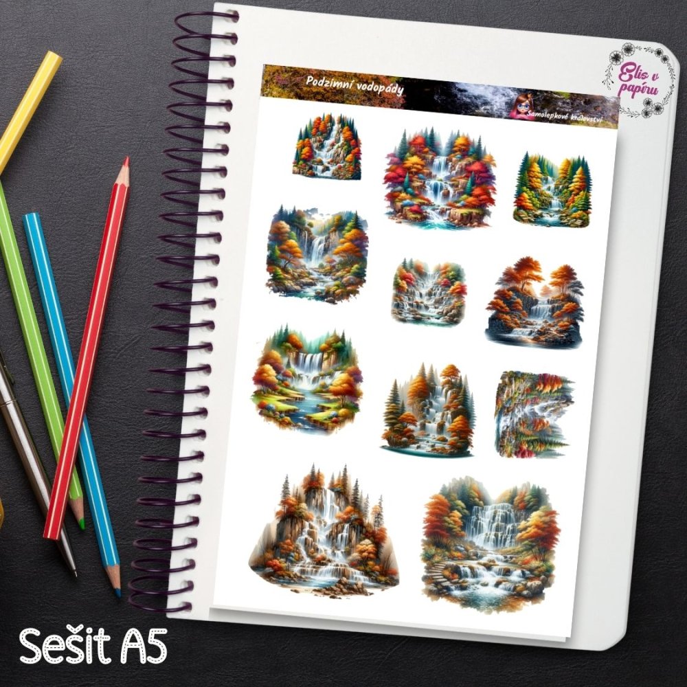 Najdeš 11 samolepek s podzimními krajinami, dominují jim vodopády, stromy v barvách podzimu a proudící říčky. Styl je snový, přírodně poetický, s výraznou barevností. Samolepky působí jako pohlednice z lesa – stačí nalepit a ponořit se do jejich atmosféry.
