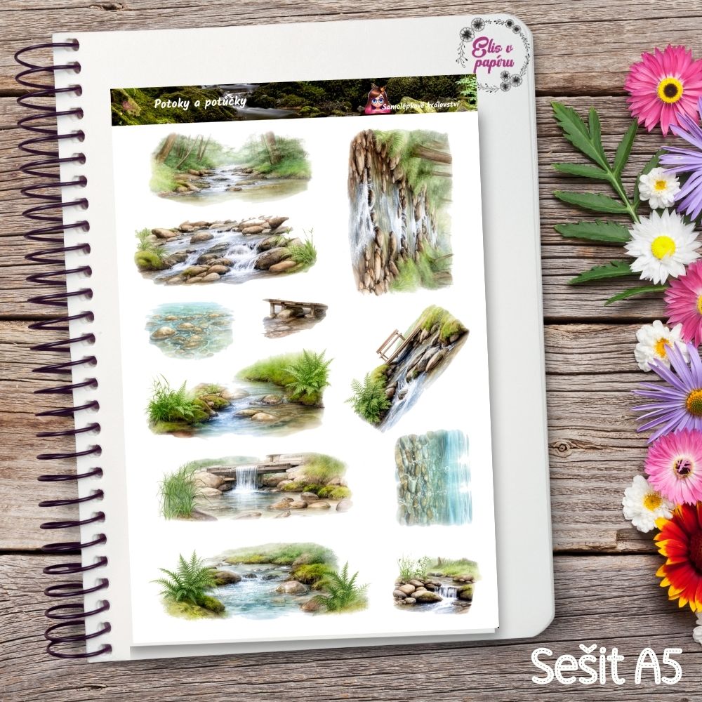 Najdeš tu potoky, kameny, malé vodopády i detaily vody v přírodě. Motivy jsou jemné, realistické a velmi harmonické. Tyto samolepky do diáře krásně doplní diářové samolepky i samolepky na bujo. Skvěle se hodí i jako papírové samolepky na scrapbook.