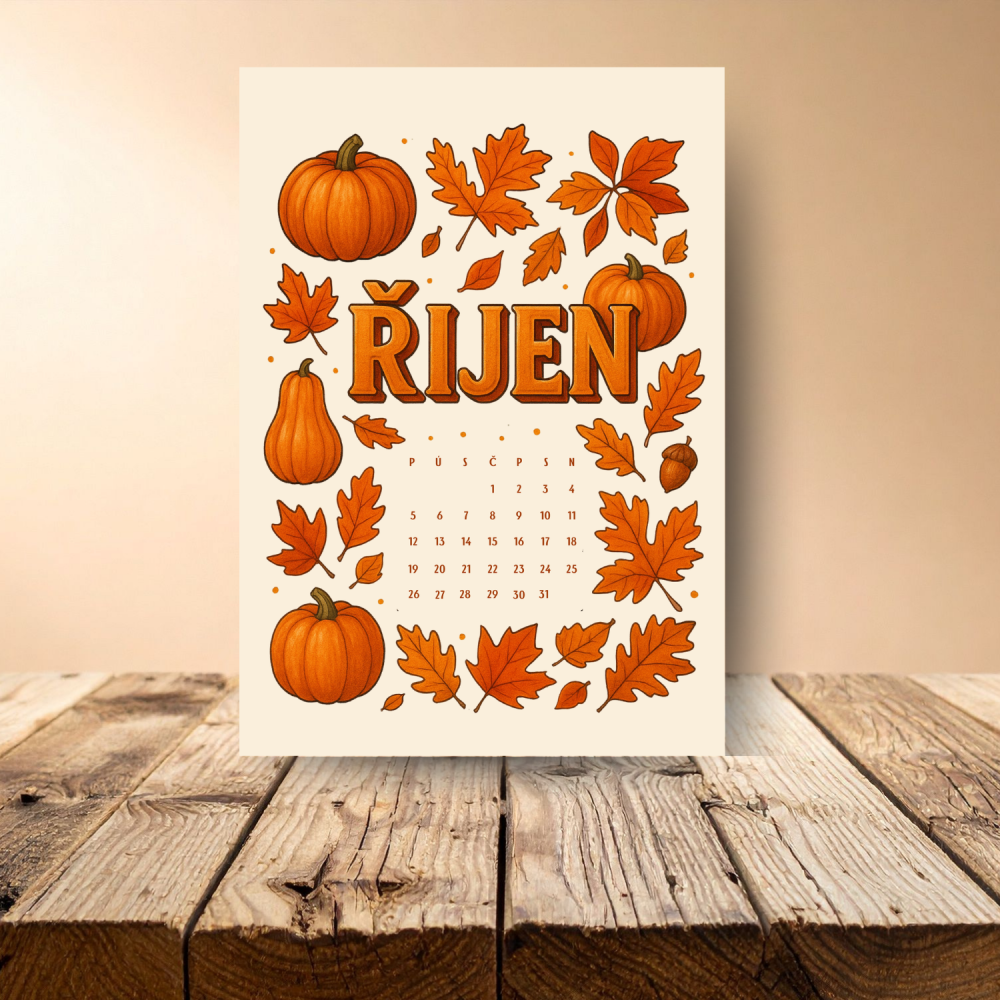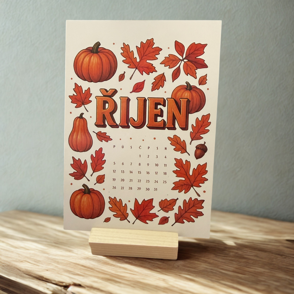 Říjnová samolepka je jako teplý čaj s medem, huňatá šála a šustění listí pod nohama. Dominantní nápis ŘÍJEN v syté oranžové barvě obklopují ilustrace dýní, barevných listů, žaludů a kaštanů. Všechno působí hřejivě, přírodně a klidně – přesně jako říjnové dny, kdy už svět zpomaluje. Uprostřed je měsíční přehled, který se hodí na plánování i journaling.