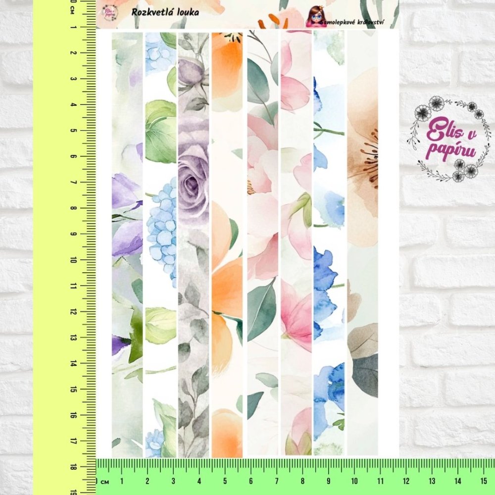Osm samolepek ve tvaru pruhů s akvarelovými květinovými motivy. Od jemných pastelů po sytější tóny – ideální pro svěží, romantické a přírodní ladění tvého tvoření.