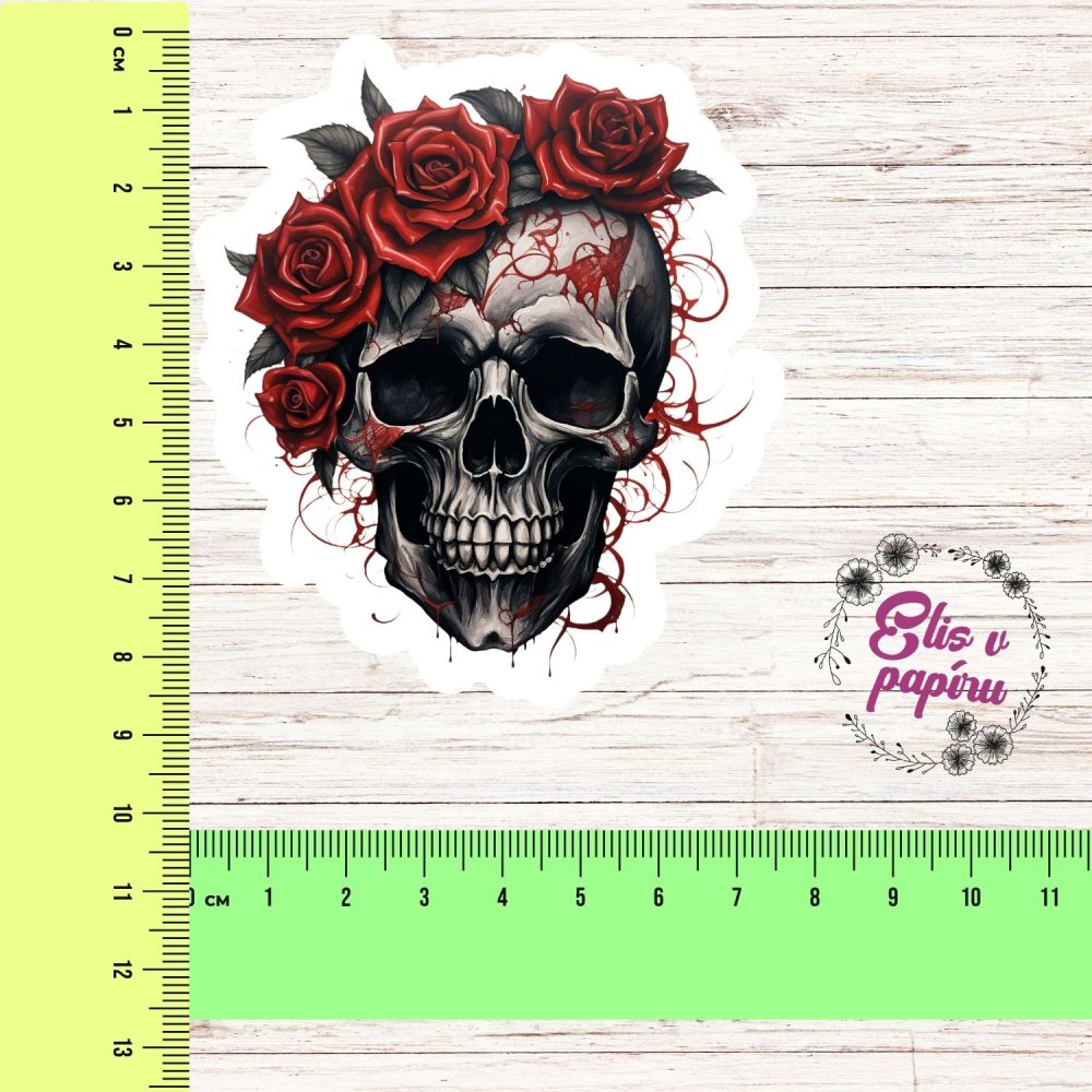 Detailně ilustrovaná lebka s věncem z rudých růží a krví prokreslenými detaily. V kontrastu černé, bílé a červené barvy vzniká silný a výrazný motiv, který vynikne na jakémkoliv povrchu. Tahle samolepka není jen dekorace – je to symbol, emoce a příběh v jednom.